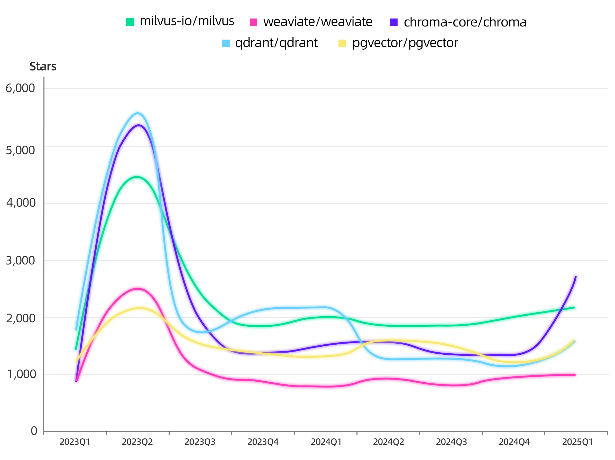 以 Qdrant,Chroma 为代表的项目收到了一波极其夸张的关注,分别收获了超过 5000 的 Star 数,但这种高关注并未形成持续的趋势。