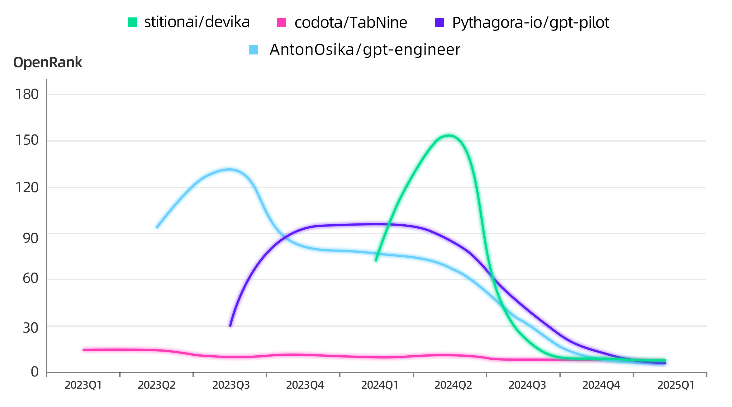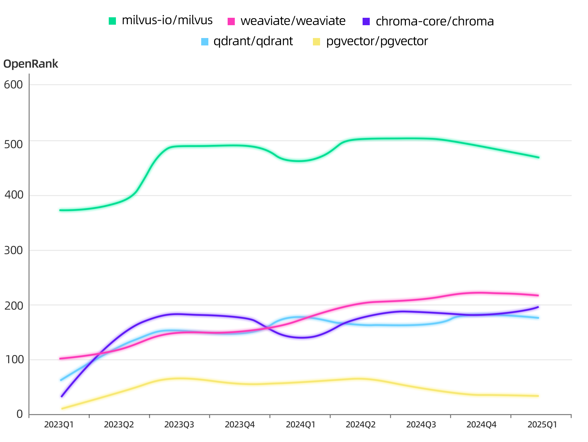 在 2024-2025 年的整体发展期,我们看到各个项目新获得的关注整体趋于稳定,没有出现很大的差异;在 OpenRank 趋势上,开源较早并且由 LF AI & Data 基金会中立托管的 Milvus 在一直保持着稳定的领先,而整个技术领域似乎像是平行的跑道,一起平稳的向前发展。