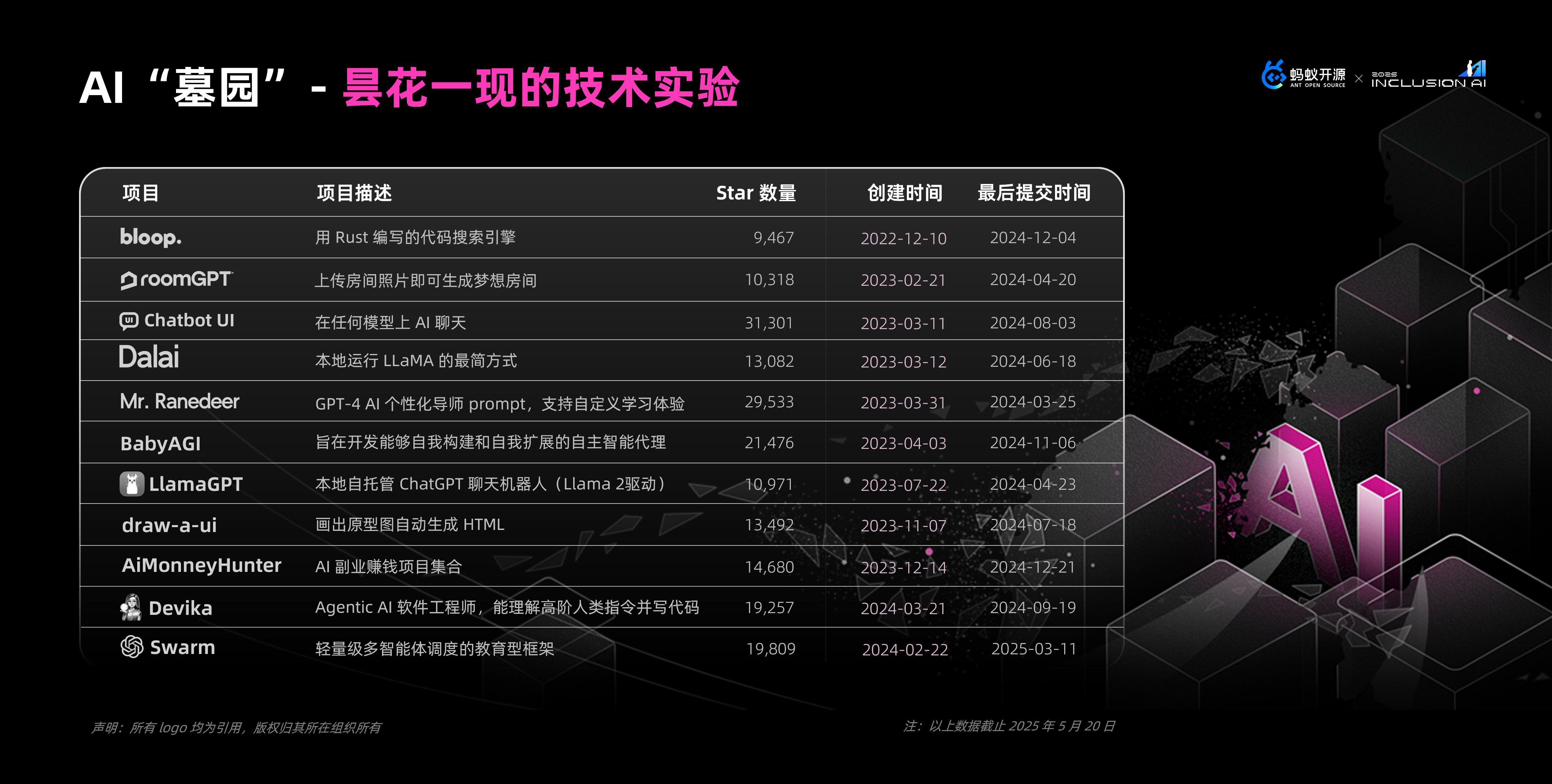 在开源生态中,也不乏这样的项目,他们在创建后的短时间内获得了大量的关注,而如今已经不再活跃,我们为这些项目做了一个“开源 AI 墓园”(如下图)。这些项目均在 2023 年之后发起,拥有上万 Star 的关注度,除了 Swarm 是由 OpenAI 在今年 3 月官方宣布不再维护外,其余项目的上一次代码提交都还停留在 2024 年。