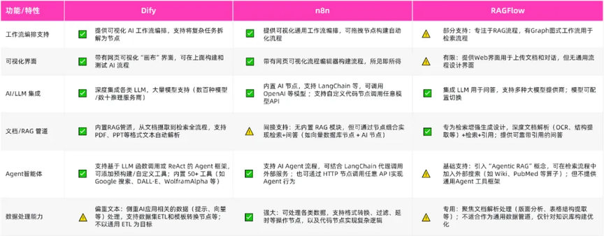 作为当前最热门的 AI 应用开发平台,Dify 精准把握了企业级用户的需求:一方面通过直观的可视化工作流编排大幅降低技术门槛,另一方面则提供完善的企业级安全管控方案。AI 应用开发者们并不缺乏新的选择,易用性、快速构建或许是当下应用开发框架的关键标签。在下表中,我们对比了当下三大主流框架的功能特性:
