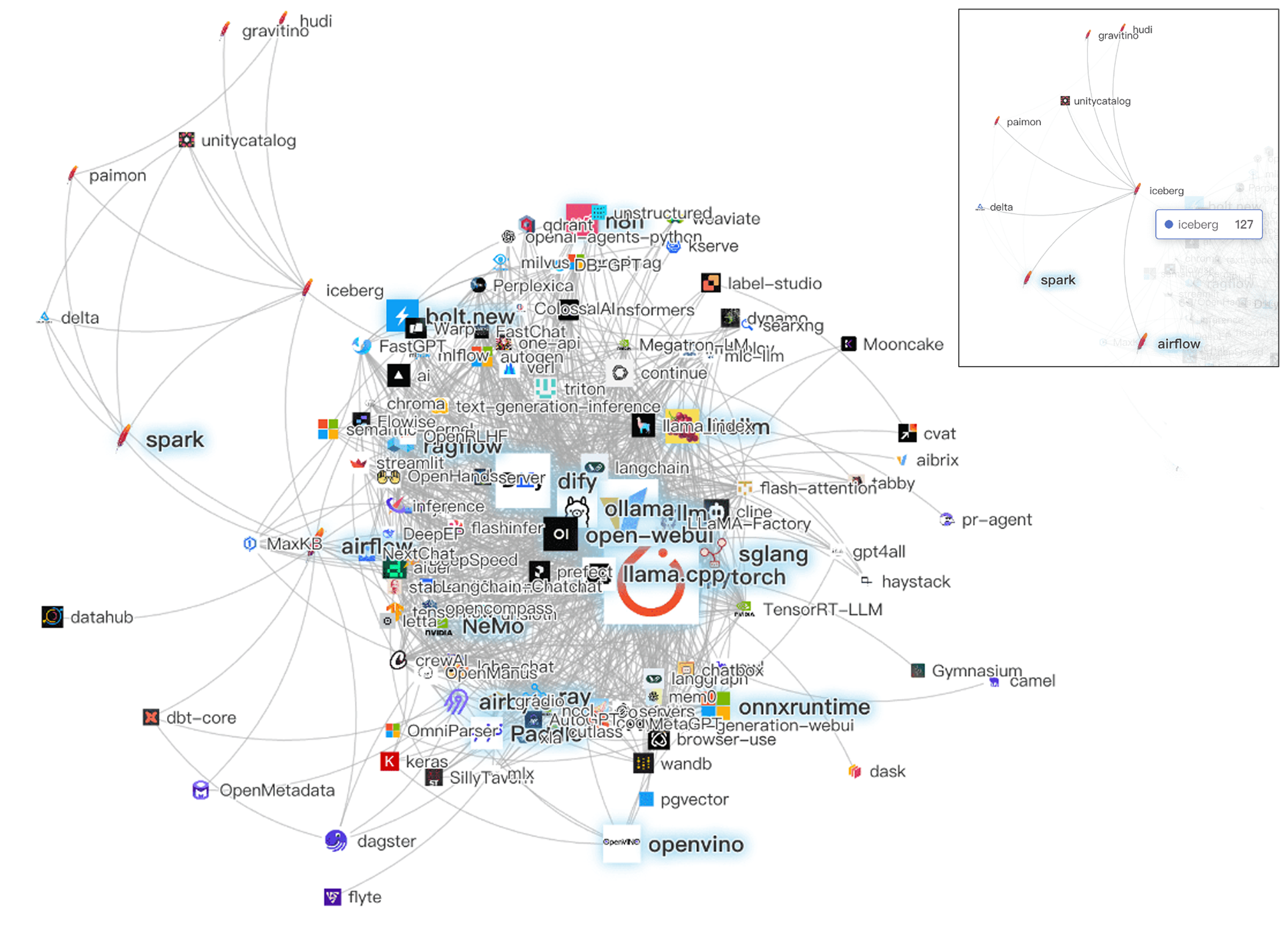 从全景图上所有项目所构成的生态协作网络上,我们可以看到大数据系统领域的这些项目们还处在整个大模型开发生态相对边缘的位置,这可能跟大数据生态下的开发者们,本身就不像 AI 生态那样密集地产生交集有关。但也从一个侧面体现出,大数据和 AI 生态的融合还在路上。在未来,随着基座模型进一步融入数据基础设施,这些项目之间的联动也许会更加紧密,无论是大数据项目为机器学习任务提供高质量的数据,还是利用模型的能力反向的支持数智化的数据治理。