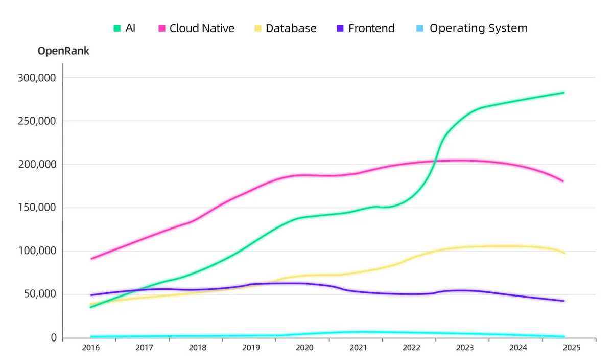 「根据 OpenDigger 的数据显示,人工智能已经于 2023 年超越云原生,成为协作影响力最大的技术领域」