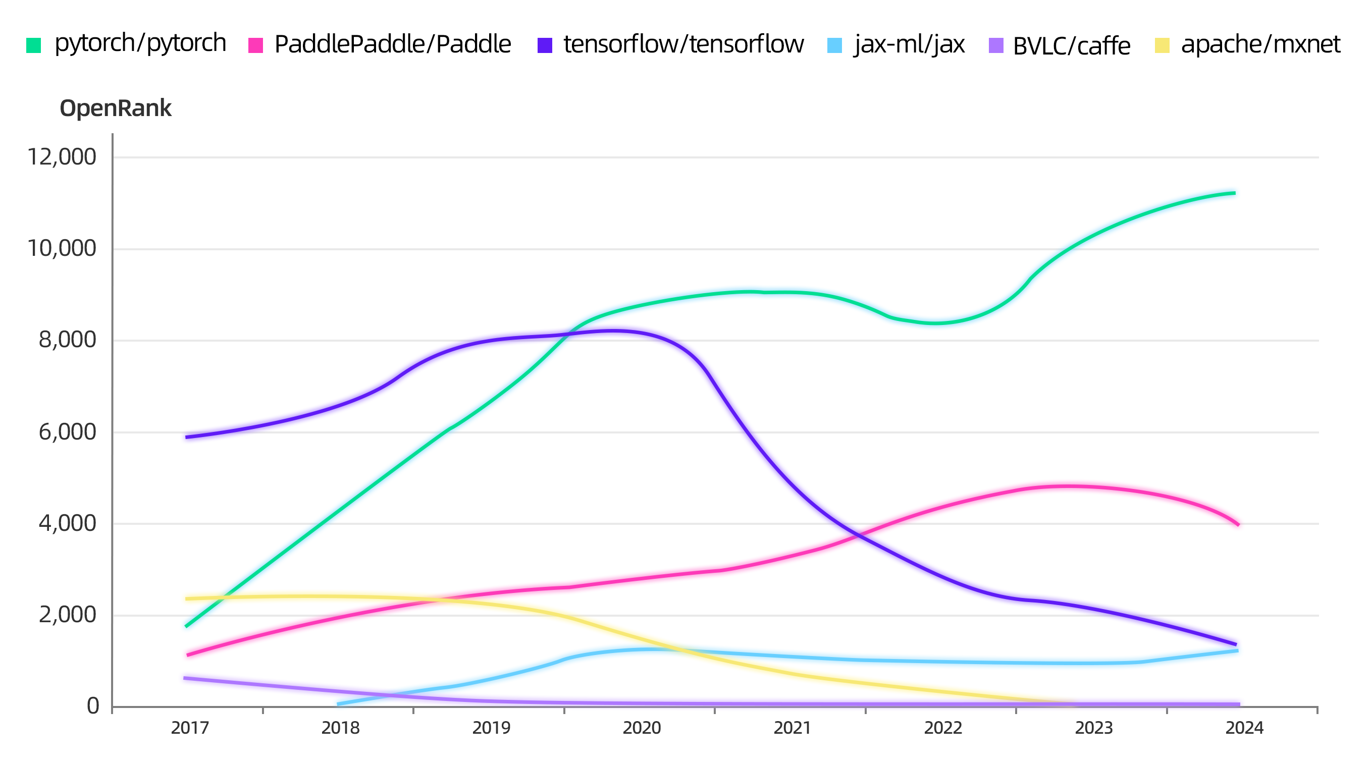 PyTorch 是如今大模型开发生态的绝对顶流和生态核心,也是模型训练领域当之无愧的事实标准。凭借模块化和轻量化的开放设计,在 2020 年正式超过了 TensorFlow,成为大模型时代深度学习的基础设施,而 TensorFlow、MXNet、Caffe 等框架已经成为了上一个时代的过去式。