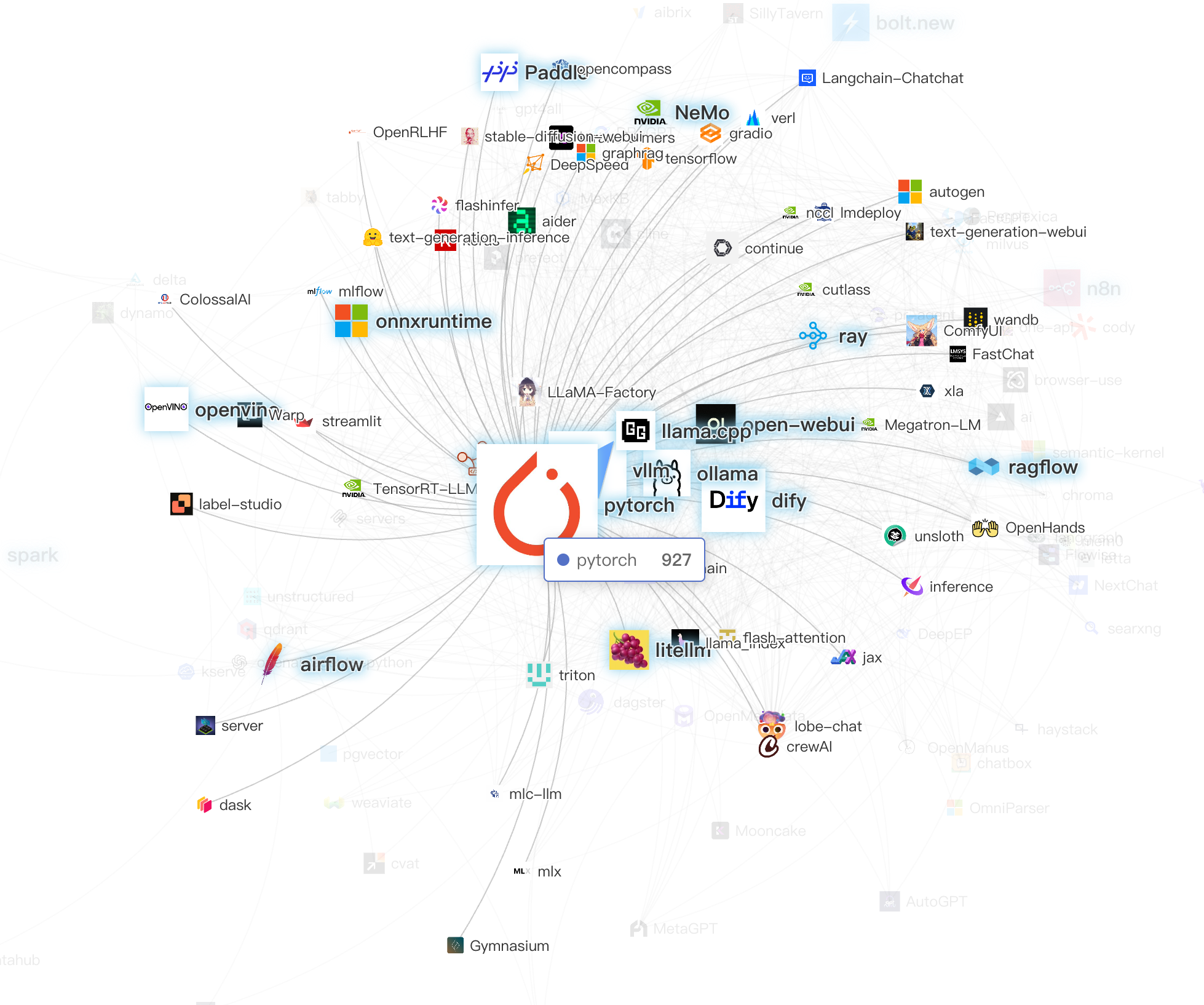 开源开发世界的一个很大的优点是,我们可以从公开数据中看到开发者们的协作分布动向,以此模拟项目们在生态之中的关联关系和生态位置:也许是上下游合作关系,也可能是同生态位竞争关系。因此,在做这份全景图的一开始,我们选取了时下 AI 领域中大家最耳熟能详的一些项目(例如 PyTorch,LangChain,vLLM 等),把它们作为种子节点,然后通过开发者在 GitHub 上的不同项目之间产生的协作关联关系,不断去探查生态的多个侧面。在得到初始的项目列表的基础上,我们和一些相关领域的开发者们探讨,手动的维护项目所属的技术领域标签,并不断做列表的收敛和更新。AI 技术迭代一日千里,我们希望呈现的是当下最顶尖的和最火热的开源项目,所以,这里用到了华东师范大学 X-lab 实验室的 OpenRank 影响力评价指标作为一个重要的数据依据——在今年的 OpenRank 月均值大于 10 的项目才会出现在全景图上,一些年久失修,或者是过于崭新的项目,如果没有达到这个阈值,则会被拿掉。