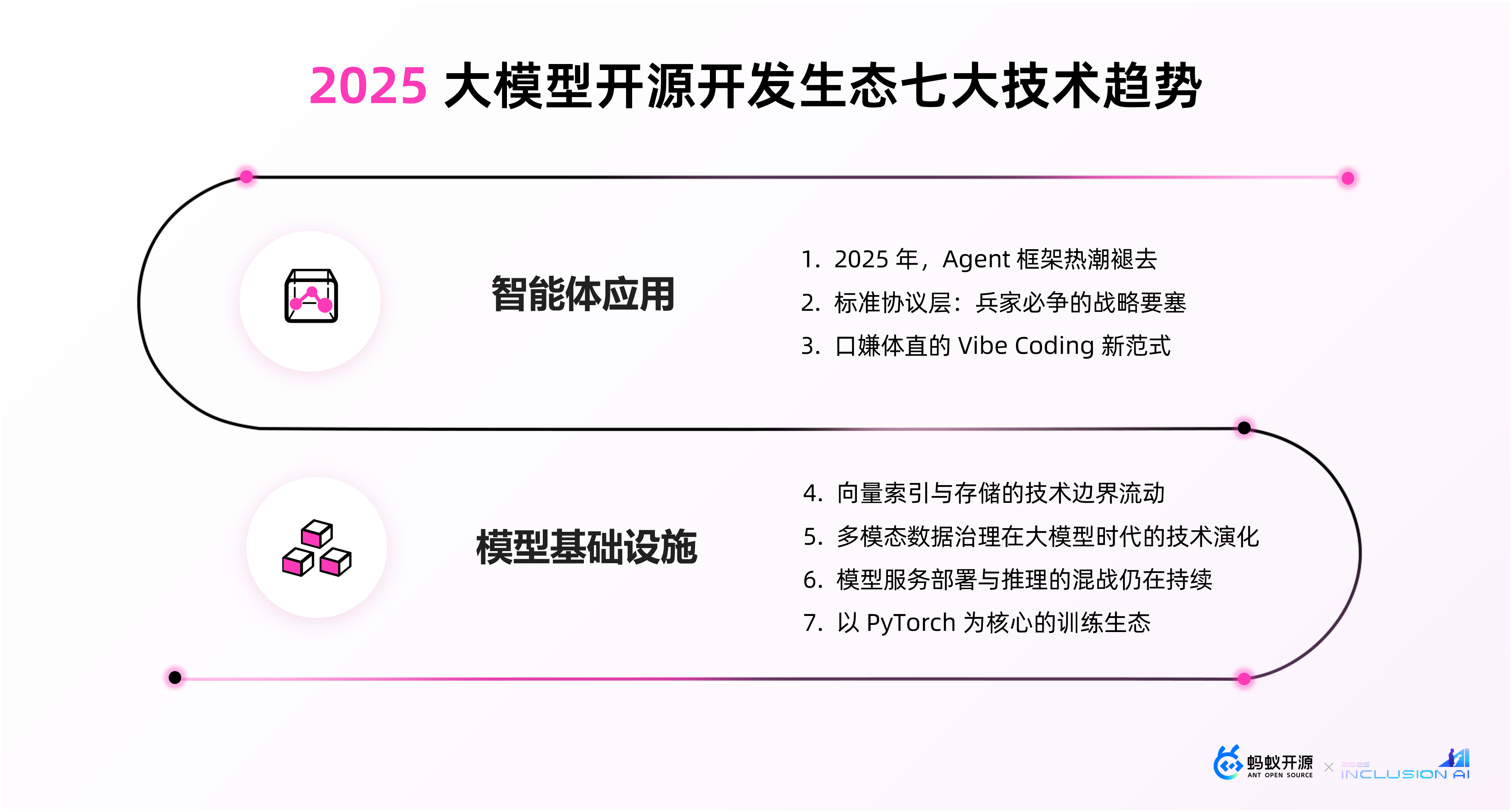 在生态全景之外,我们选取了当下热门的七大趋势,基于社区数据进行了趋势分析、行业观察,并且比较大胆的做了一些趋势论断。这些趋势包括了在大模型时代新兴出现的生态,例如以应用层为主的 Agent 开发框架,以 MCP 为代表的 AI 原生标准协议,改变了软件开发模式的 Coding Agent;也包括了发生在传统的大数据和人工智能领域的生态,它们在大模型时代也发生了一些转向,有些领域一度被显著地波及,例如向量化的存储,也有些领域发生了生态格局的颠覆,例如模型的推理服务。