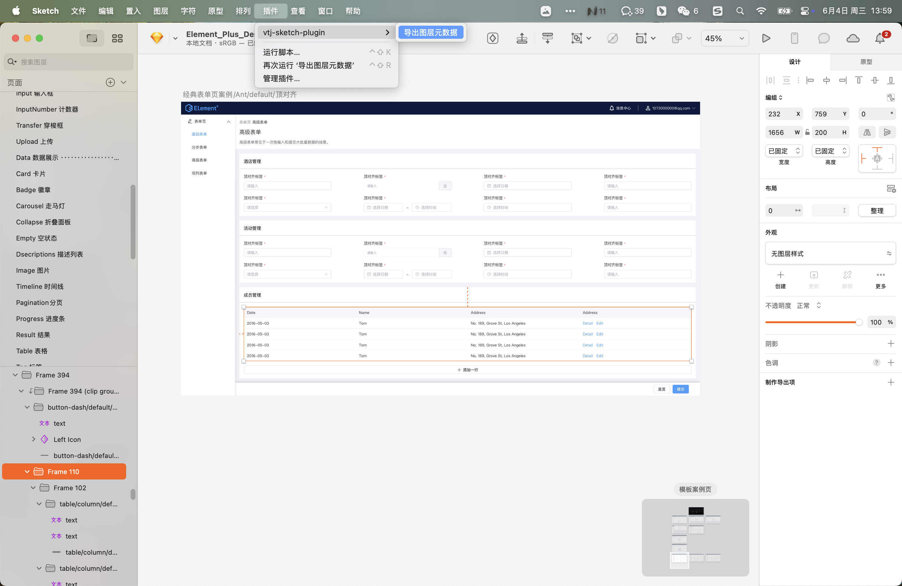 复制到 Sketch 的插件文件夹,即完成安装。打开Sketch,选中你需要导出的图层,然后点击菜单: 插件 > vtj-sketch-plugin > 导出图层元数据