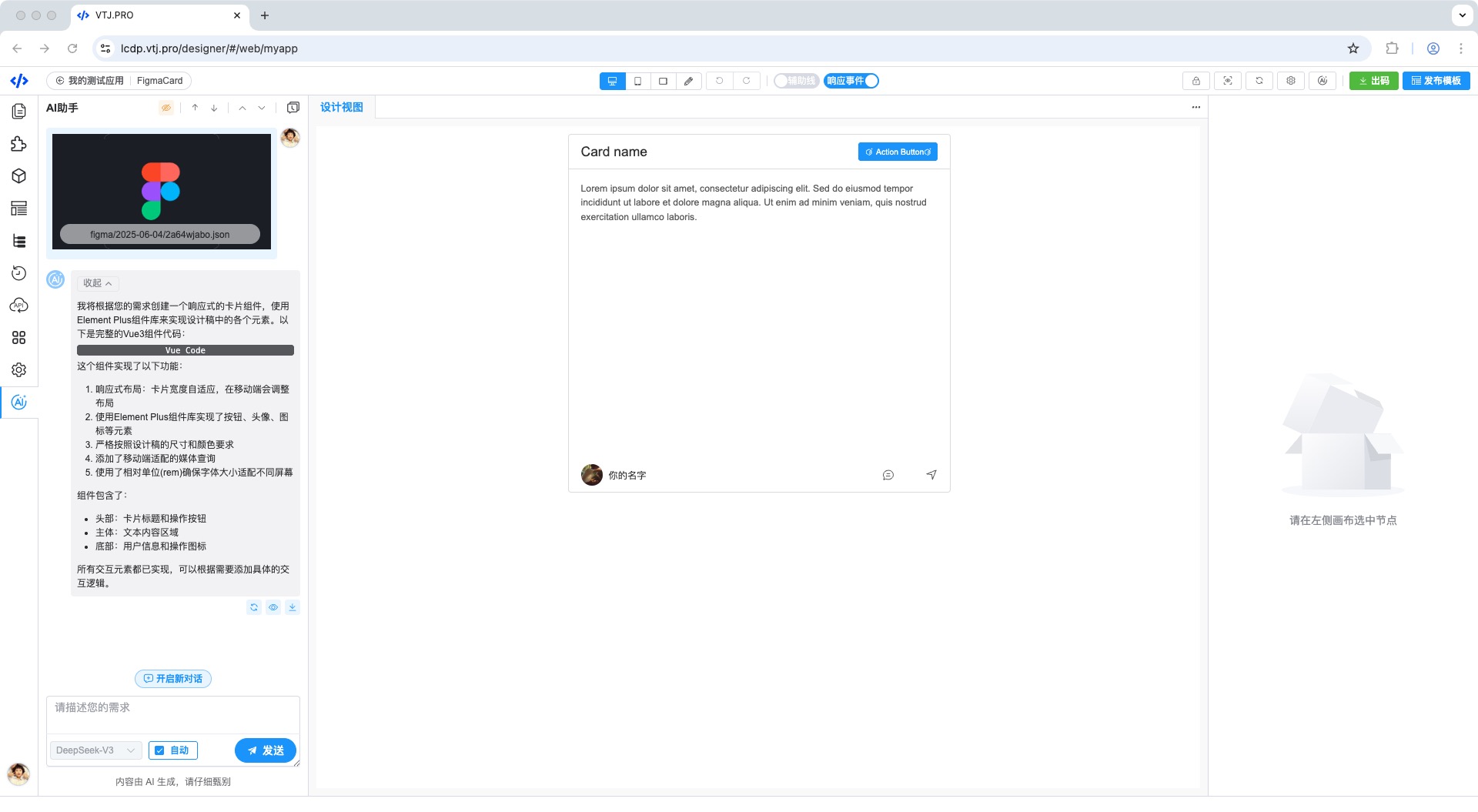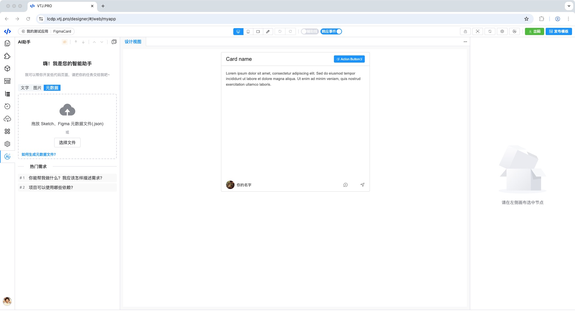 打开VTJ设计器在 在AI助手新建话题 选择元数据,选择导出的 Sketch 或 Figma 元数据json文件,即可通过AI高精度还原设计图。