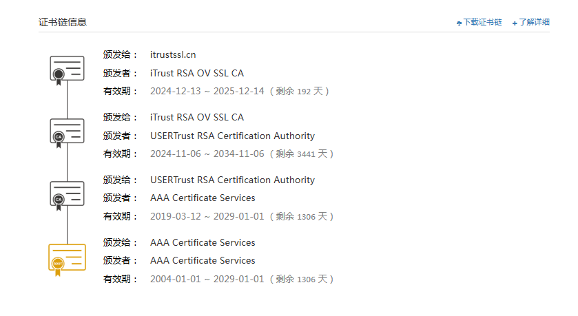 如上图,AAA Certificate Services 根证书的有效期2004-01-01 ~ 2029-01-01,并附上了剩余时长。而最终网站使用的服务器SSL证书的有效期是1年。