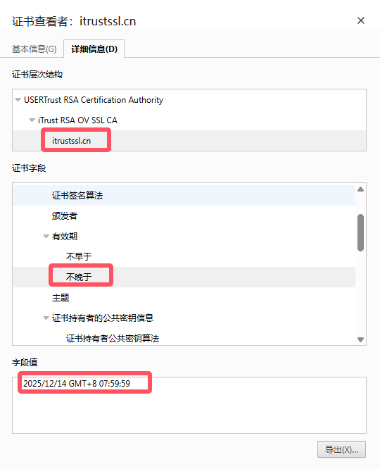 如果想查询该SSL证书链上的根证书和中间证书的有效期正常可以点击详细信息,通过切换证书层次结构,来查看相关时间: