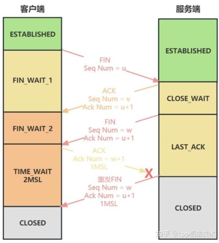 4.第四次挥手:客户端收到报文后,发出一个 ACK 报文应答,上一次客户端发送的报文序列号为 seq=u,那么这次序列号就是 seq=u+1,确认号为 ack=w+1。此时客户端处于 TIME_WAIT 状态,需要经过一段时间确保服务器收到自己的应答报文后,才会进入 CLOSED 状态。