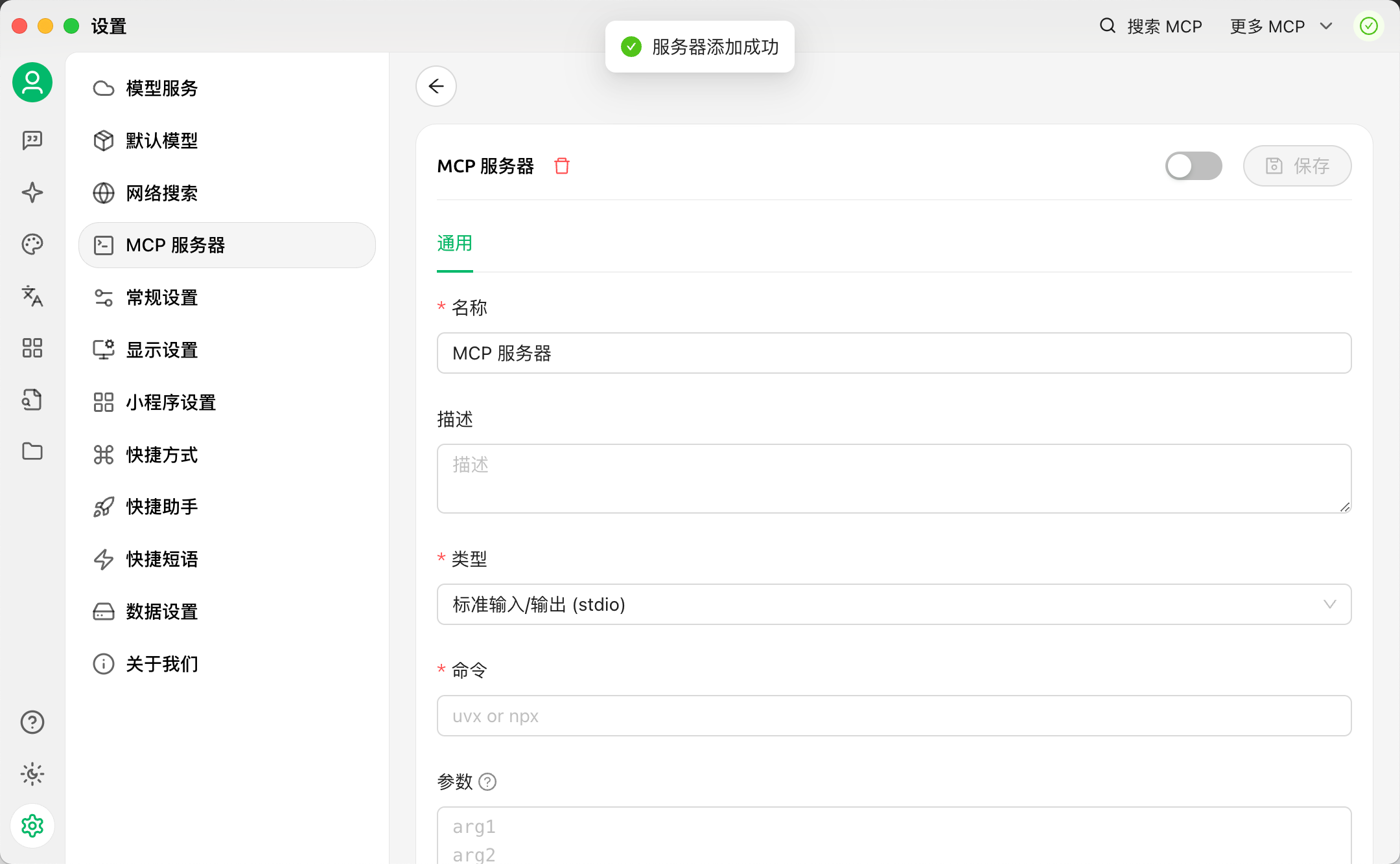 2、依次填入 MCP 服务器的名称、类型、命令、参数(如有)、环境变量(如有)。