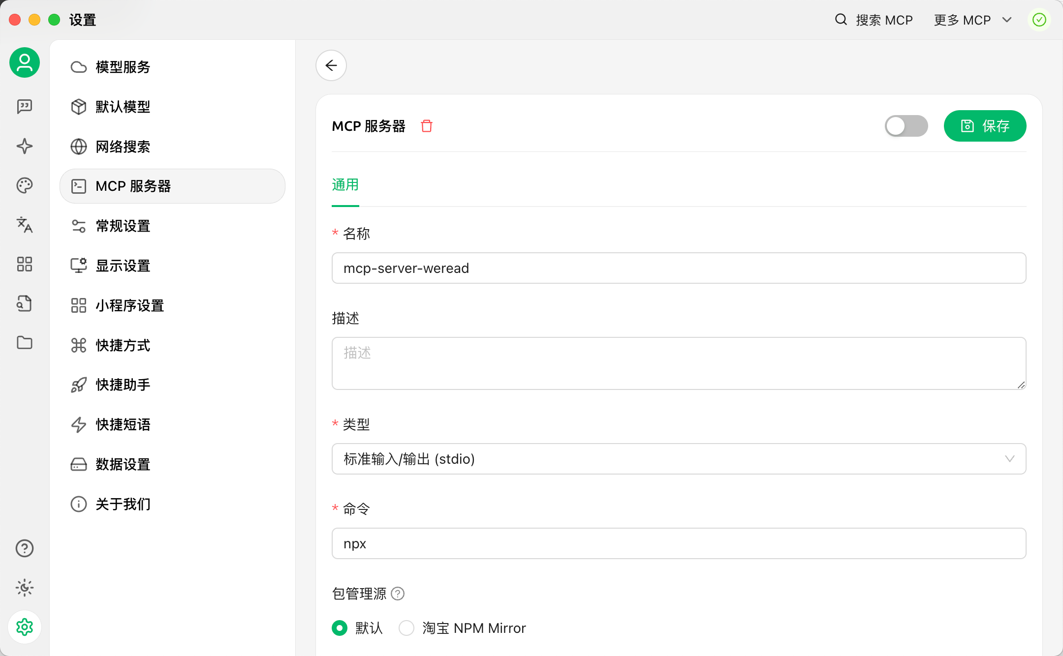 PS:此处的环境变量用于传递配置参数或敏感信息,最常用为 MCP Server 所调用应用的 API 密钥,以便顺利访问外部应用。