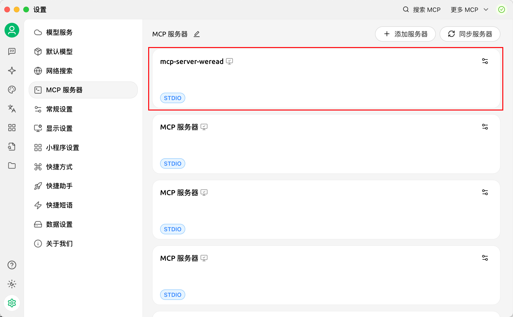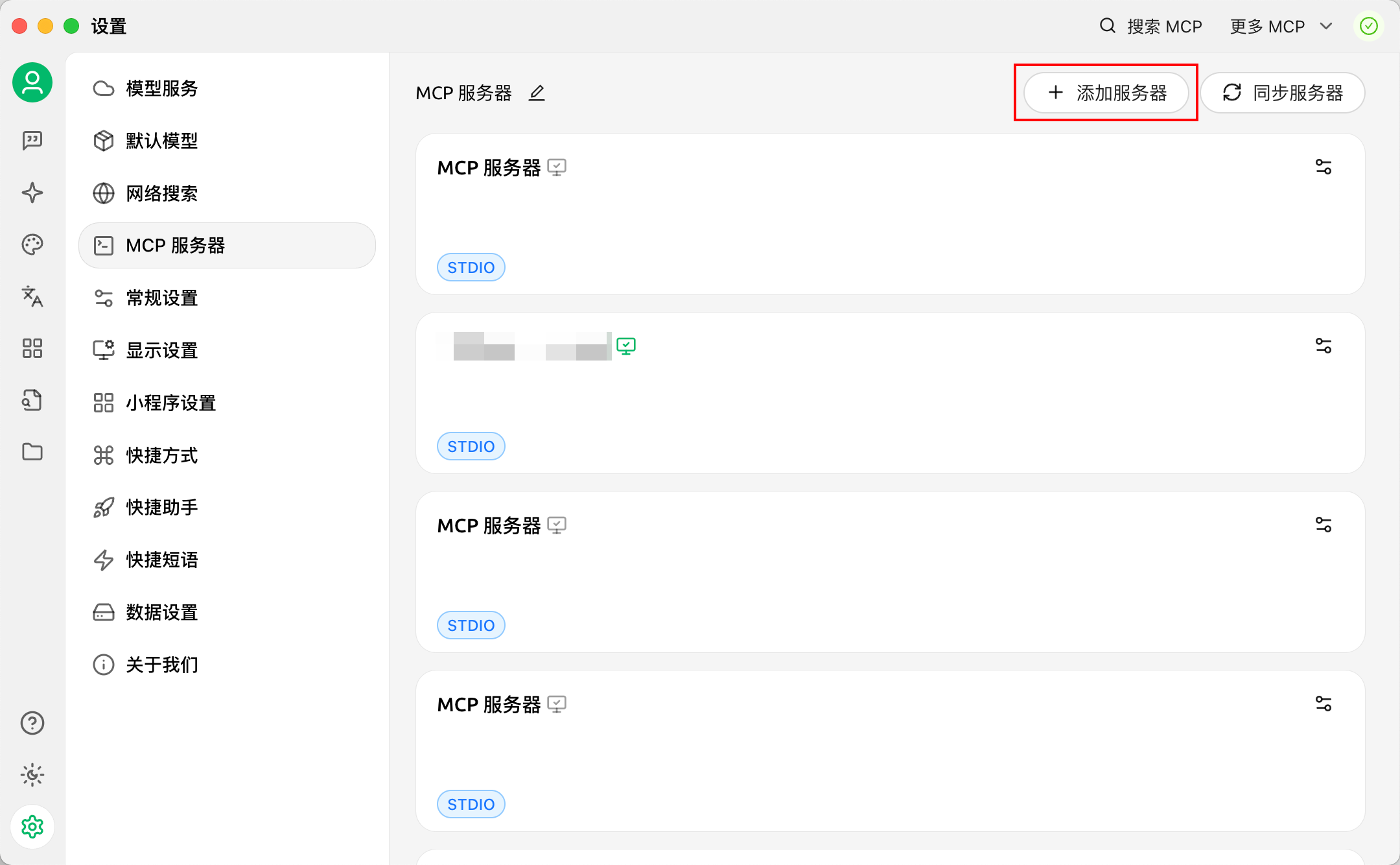 1、单击右上角的添加服务器按钮,进入 MCP 服务器配置页。