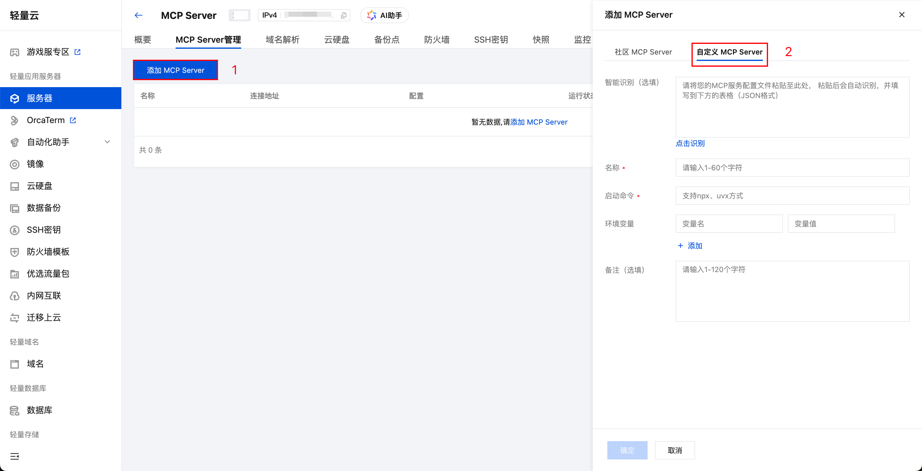 2、(推荐)您可以选择将支持 npx 或 uvx 部署方式的 MCP Server 配置内容粘贴至智能识别框内,即可快速识别并自动填写名称、启动命令等配置项。各配置项的格式要求如下: