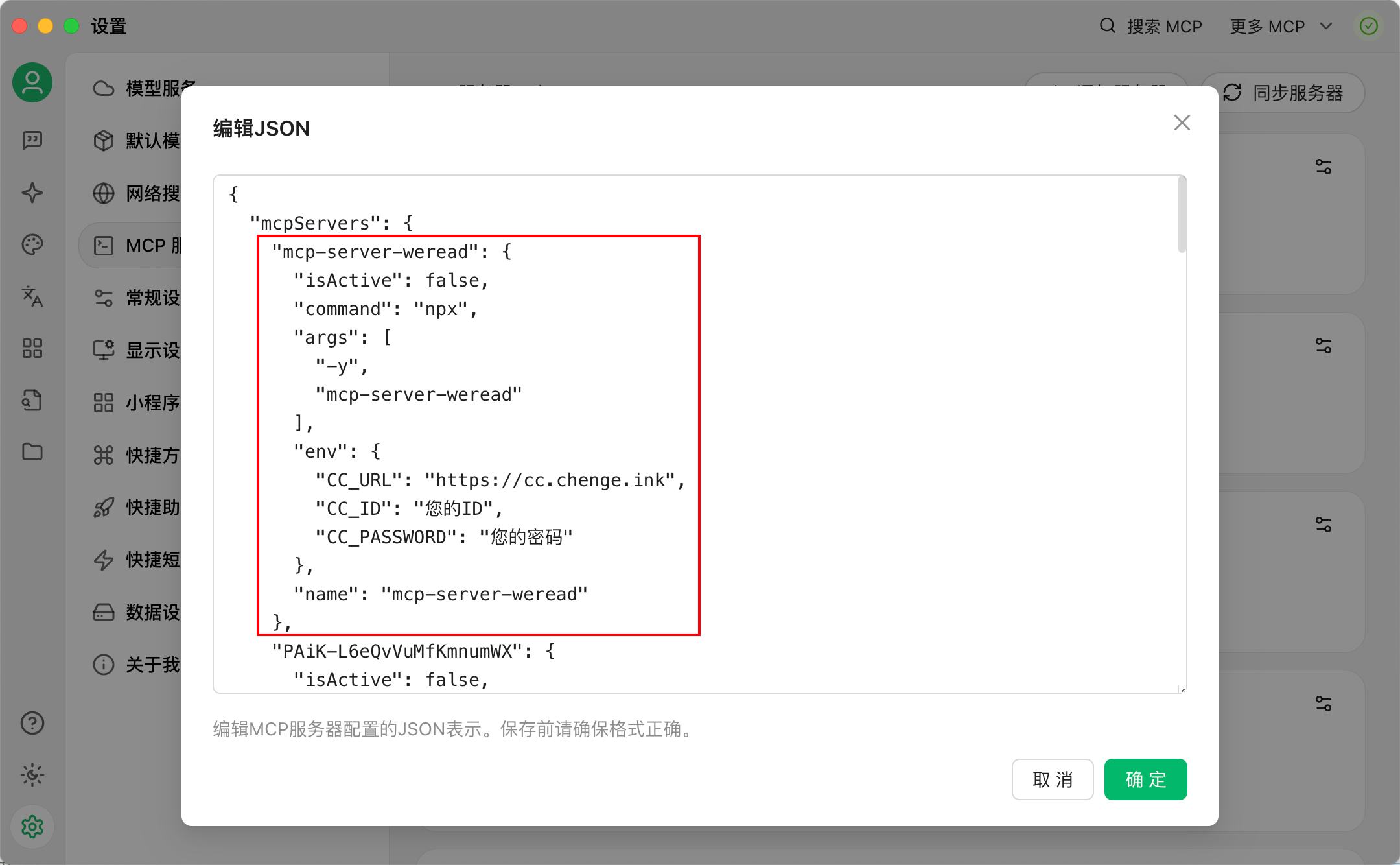 2、以正确的结构插入 MCP Server 的 JSON 内容,此处以微信读书 MCP Server 为例,将 JSON 配置插入编辑弹窗中,调整环境变量值后单击确定即可完成添加。