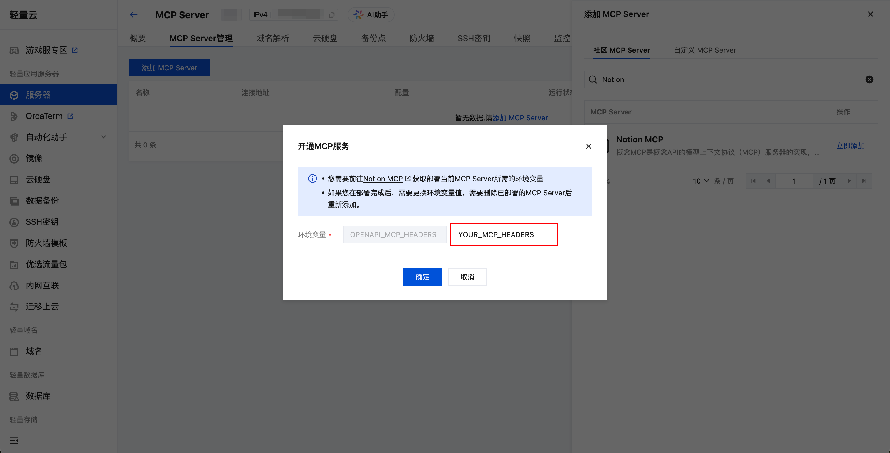 2、单击列表内的立即添加,在开通 MCP 服务弹窗内,填入部署 Notion MCP 所需的环境变量。