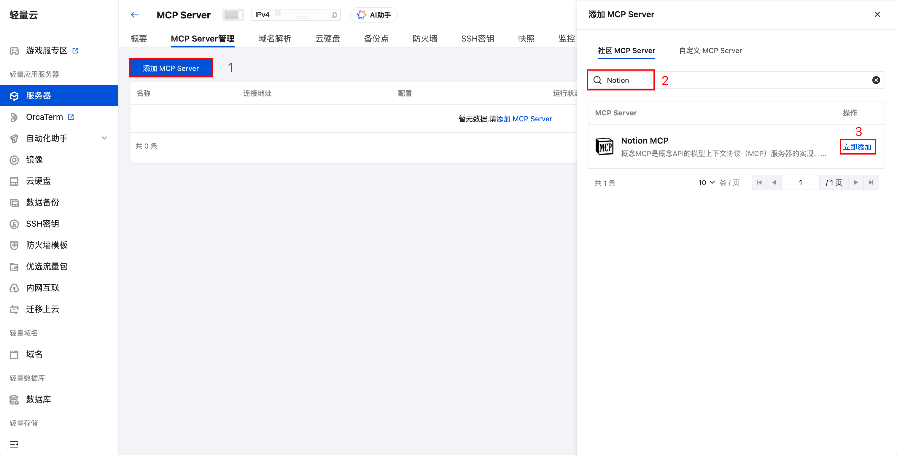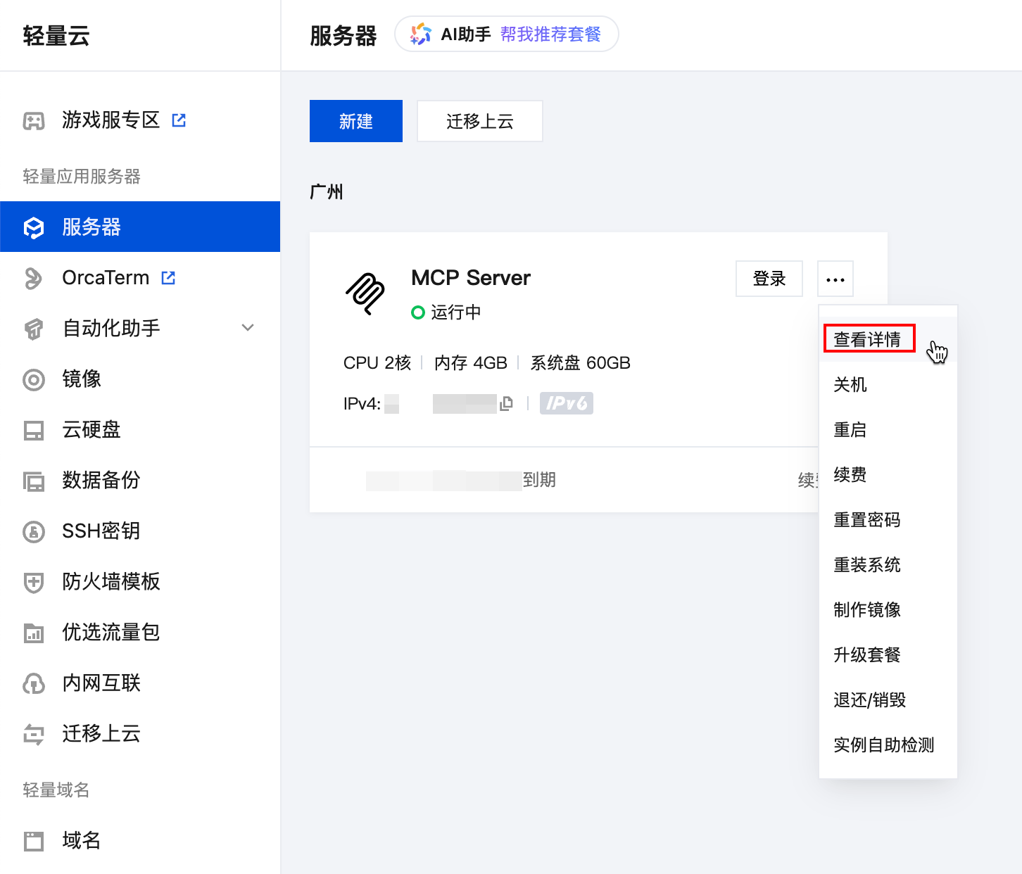 PS:待实例重装或创建完成后,在服务器列表中单击右上角 > 查看详情并进入该实例的详情页。选择 MCP Server 管理页签,进入 MCP Server 详情页,即可进行后续操作。