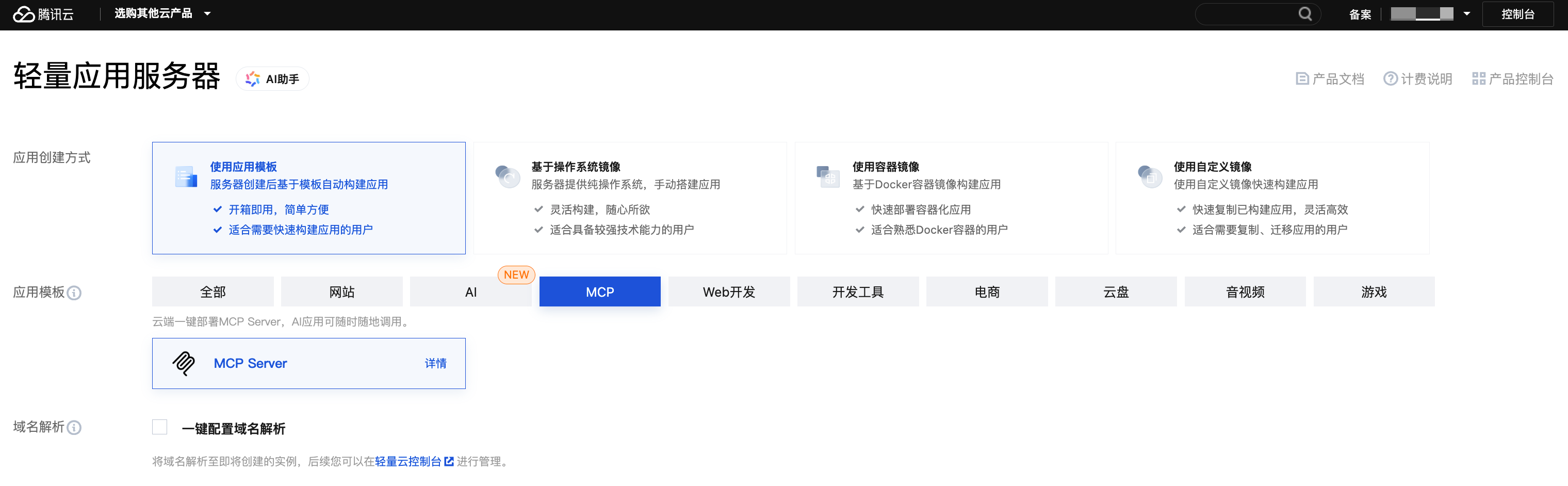 Lighthouse提供了MCP Server应用模板,内置了MCP Server运行的必要环境,无需手动配置,并且支持一键部署社区热门的MCP Server或自定义MCP Server。