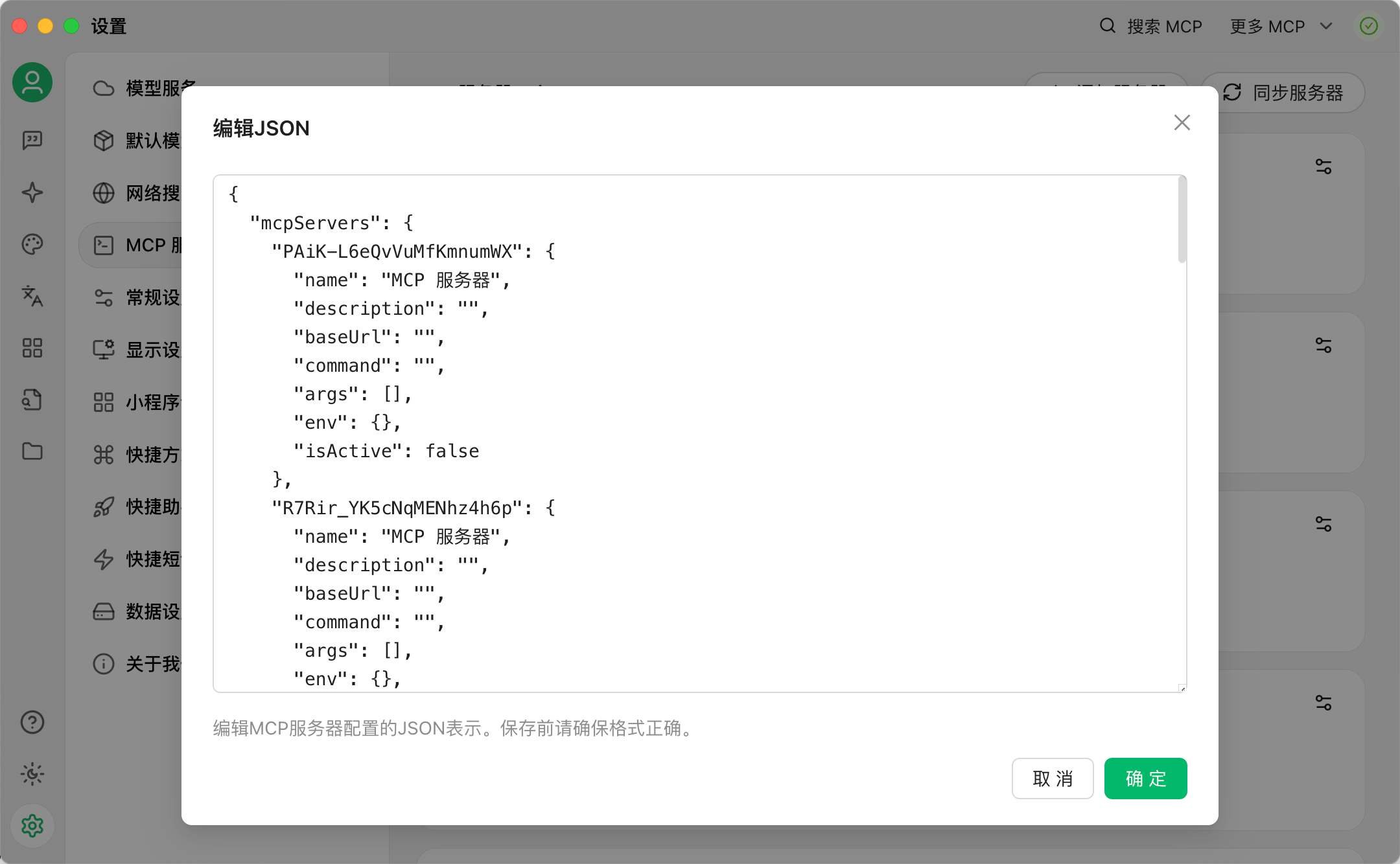 1、单击左上角 MCP 服务器旁的编辑按钮,打开编辑 JSON 弹窗。