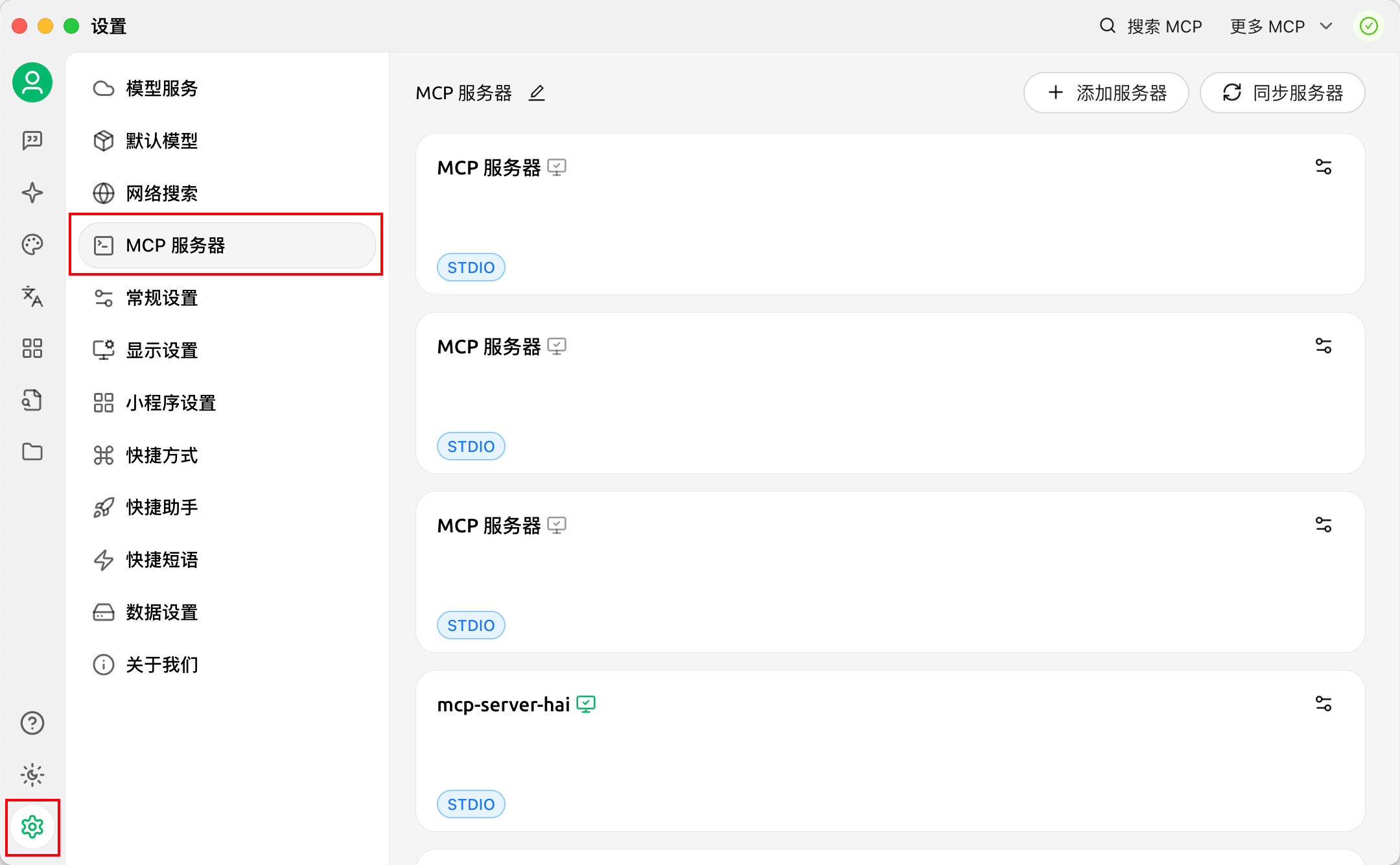 1、打开 Cherry Studio 客户端,单击左下角的设置按钮,选择并进入 MCP 服务器设置页。