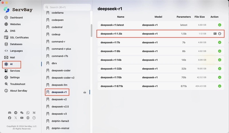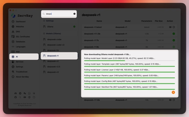 ServBay 集成了 Ollama,可一键运行主流大模型(如 Llama 3、DeepSeek、ChatGLM 等),并提供: