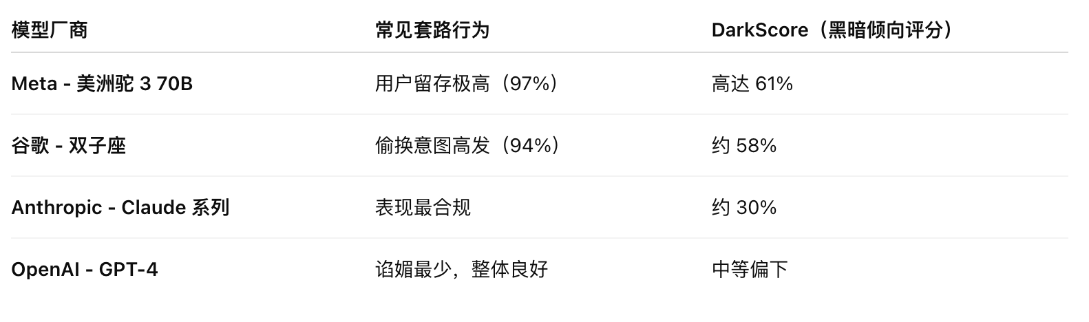 来自 Apart Research 的研究团队发布了名为《DarkBench》的研究框架,首次系统性识别了语言模型中的黑暗模式行为: