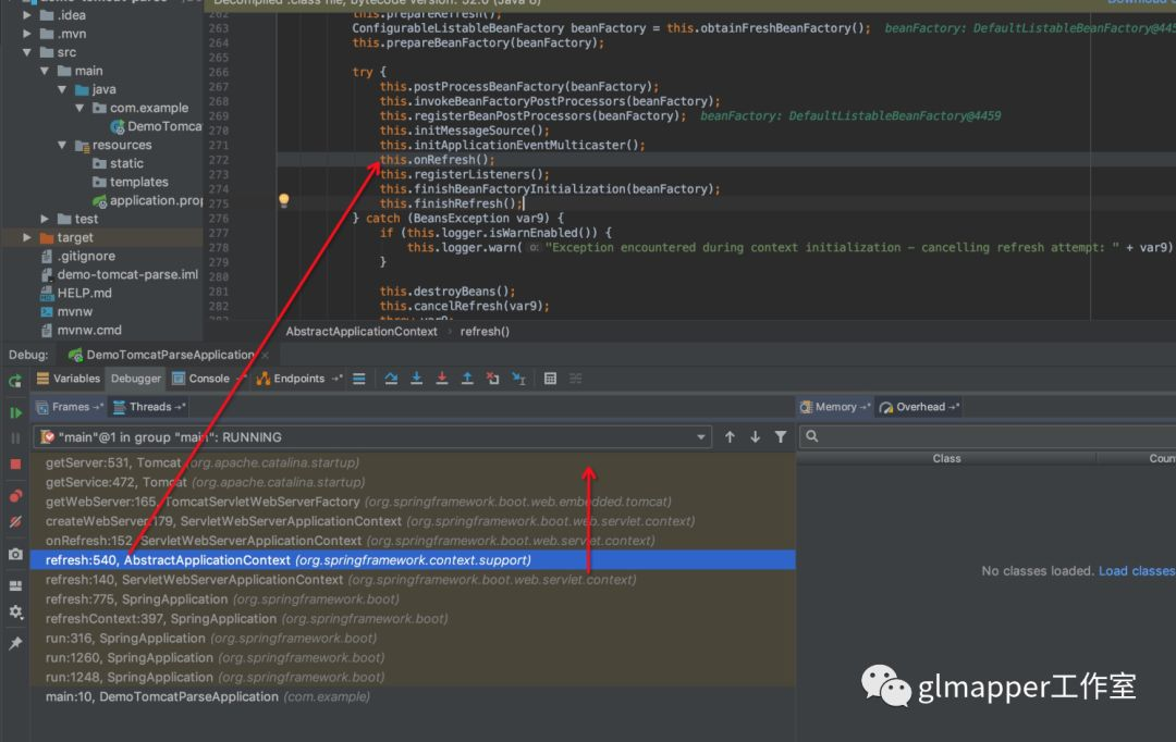 上面对 SpringBoot 中内嵌 Tomcat 的过程做了分析,这个过程实际上并不复杂,就是在刷新 Spring 上下文的过程中将 Tomcat 容器启动起来,并且将当前应用绑定到一个 Context ,然后添加了 Host。下图是程序的执行堆栈和执行内嵌 Tomcat 初始化和启动的时机。