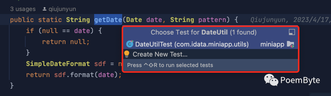 在前面的测试分类中,单元测试主要是验证单个代码单元(通常是函数、方法、类等)的正确性;在实际的项目中,单元测试主要是对于一个封装好的工具类的测试。如在 DateUtil 工具类中有一个方法: