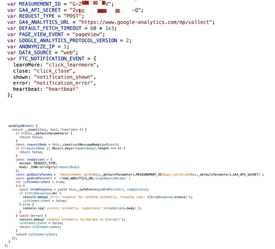 代码片段显示了硬编码的 Google Analytics 4(GA4)API 密钥 | 图片来源:Symantec