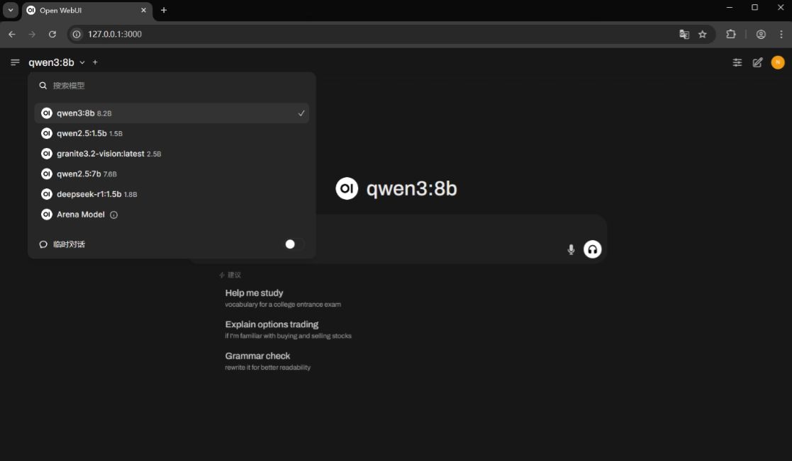 完成部署后,在浏览器中访问127.0.0.1:3000,设置本地管理员账号,之后就可以通过网页界面与DeepSeek-R1进行交互了!