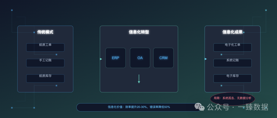 大多数企业都从这一阶段起步,引入OA、ERP、CRM等系统,将线下流程搬到线上。这一阶段的特征: