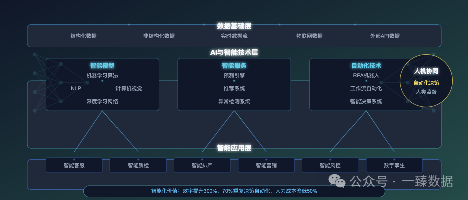 智能化阶段的核心是引入AI和自动化技术,实现业务流程的智能决策和自动执行。这一阶段的特征: