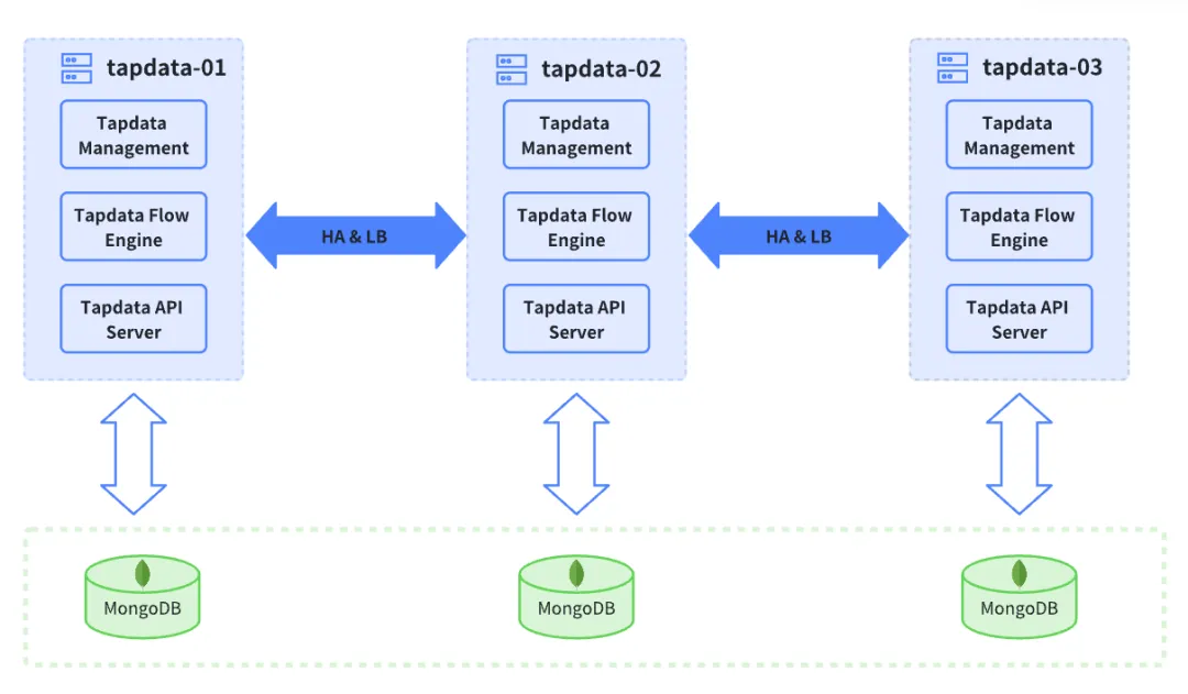 TapData 与 MongoDB 部署在三台服务器上,构建了一套高可用、负载均衡的三节点TapData集群架构。该架构的核心特性包括:
