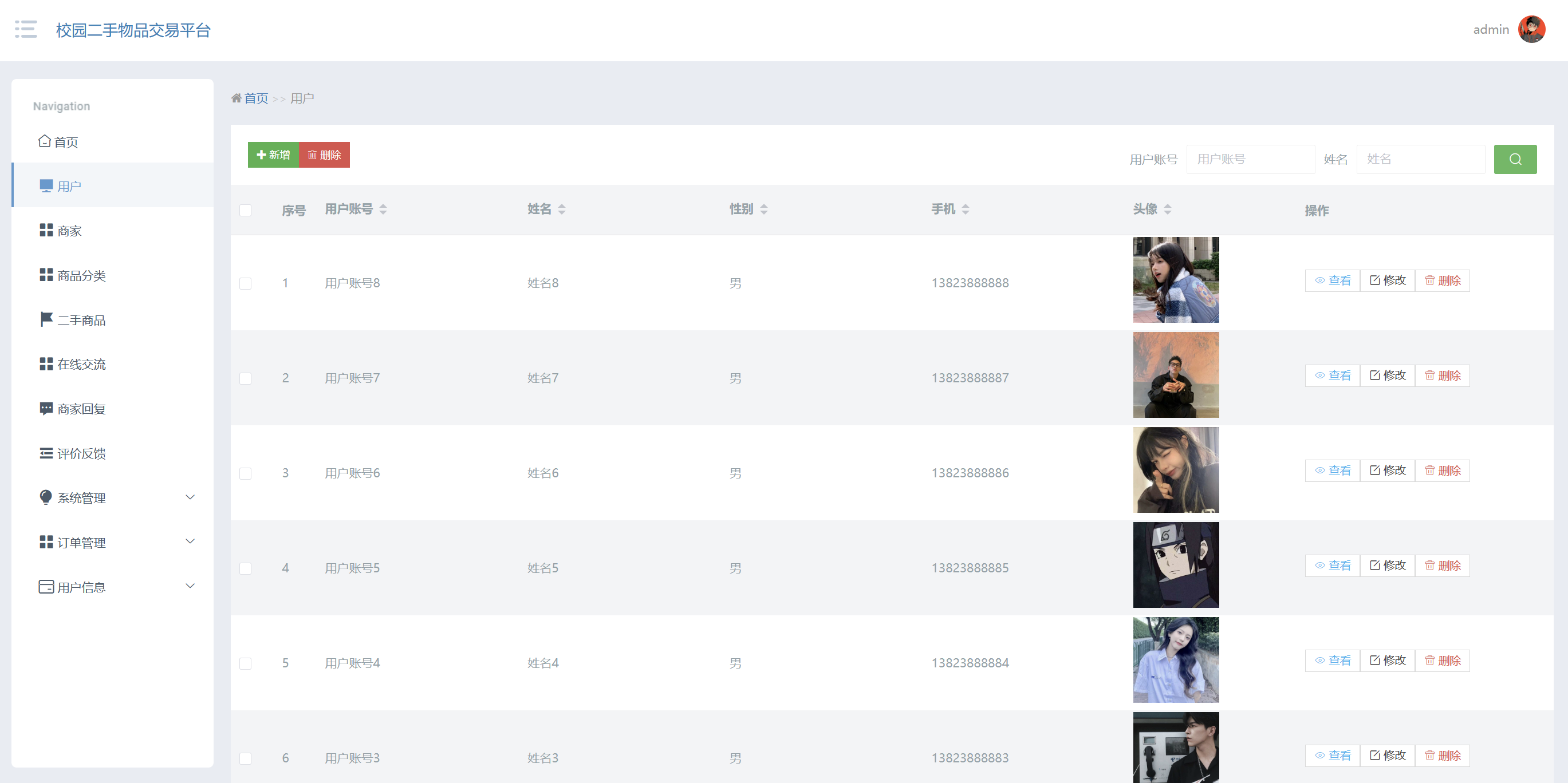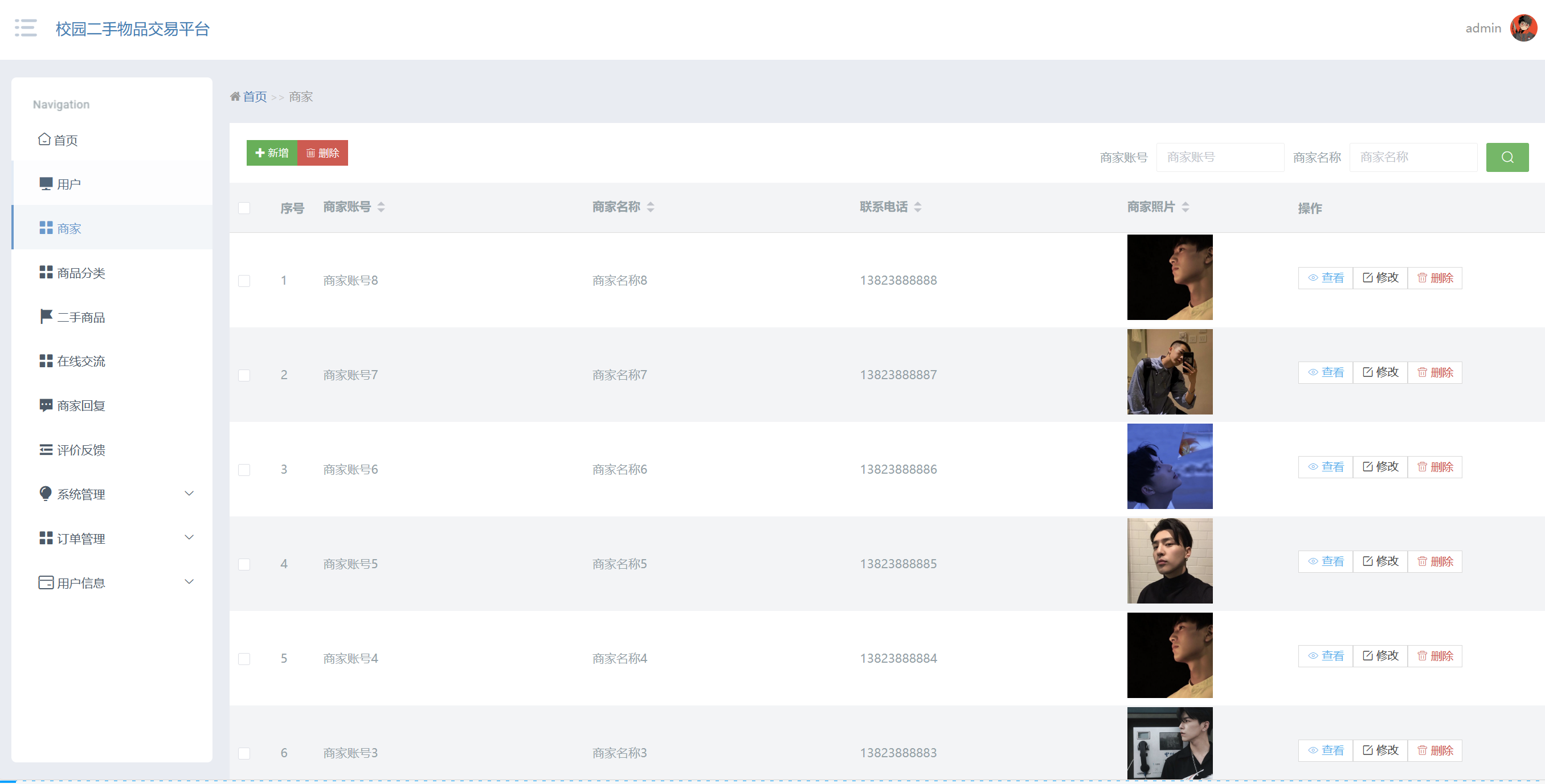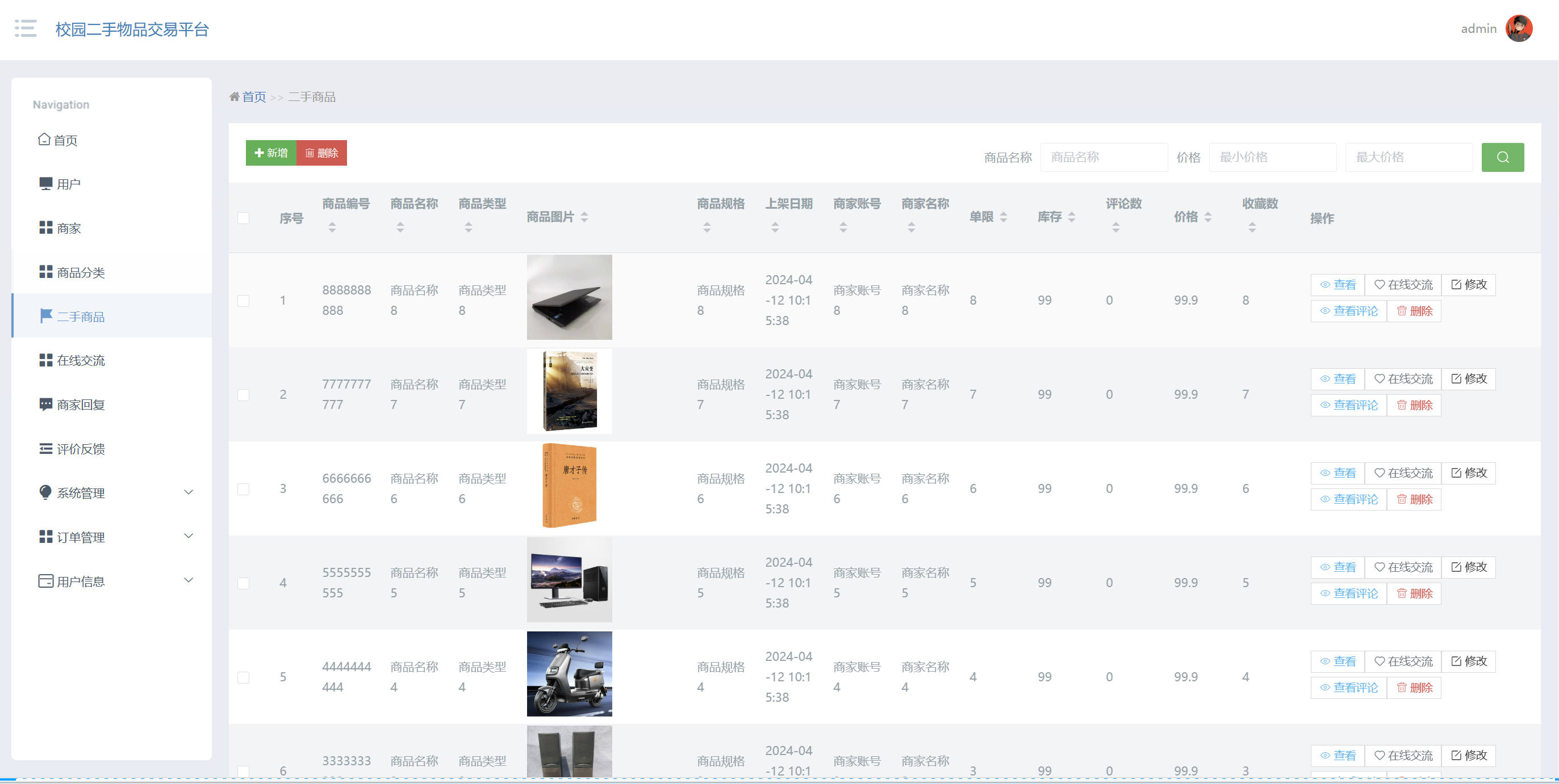 管理员点击二手商品:在二手商品页面,可以对商品编号、商品名称、商品类型、商品图片、商品规格、上架日期、商家账号、商家名称、单限、库存、评论数、价格、收藏数等信息,进行查询、新增或者删除二手商品等操作,如图5-12所示: