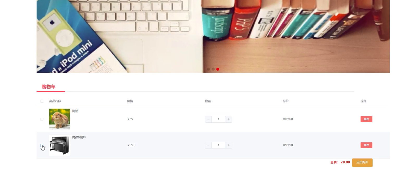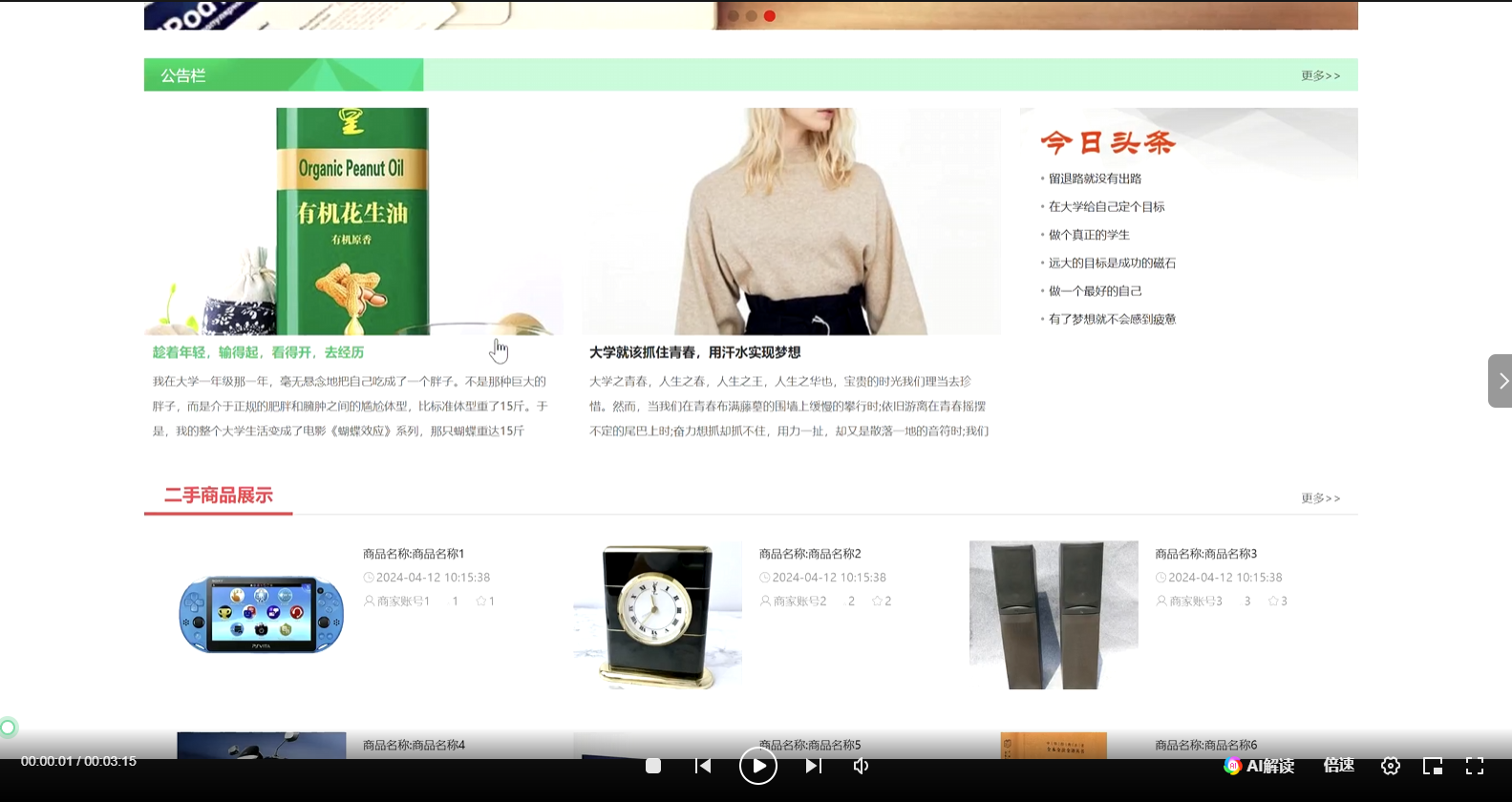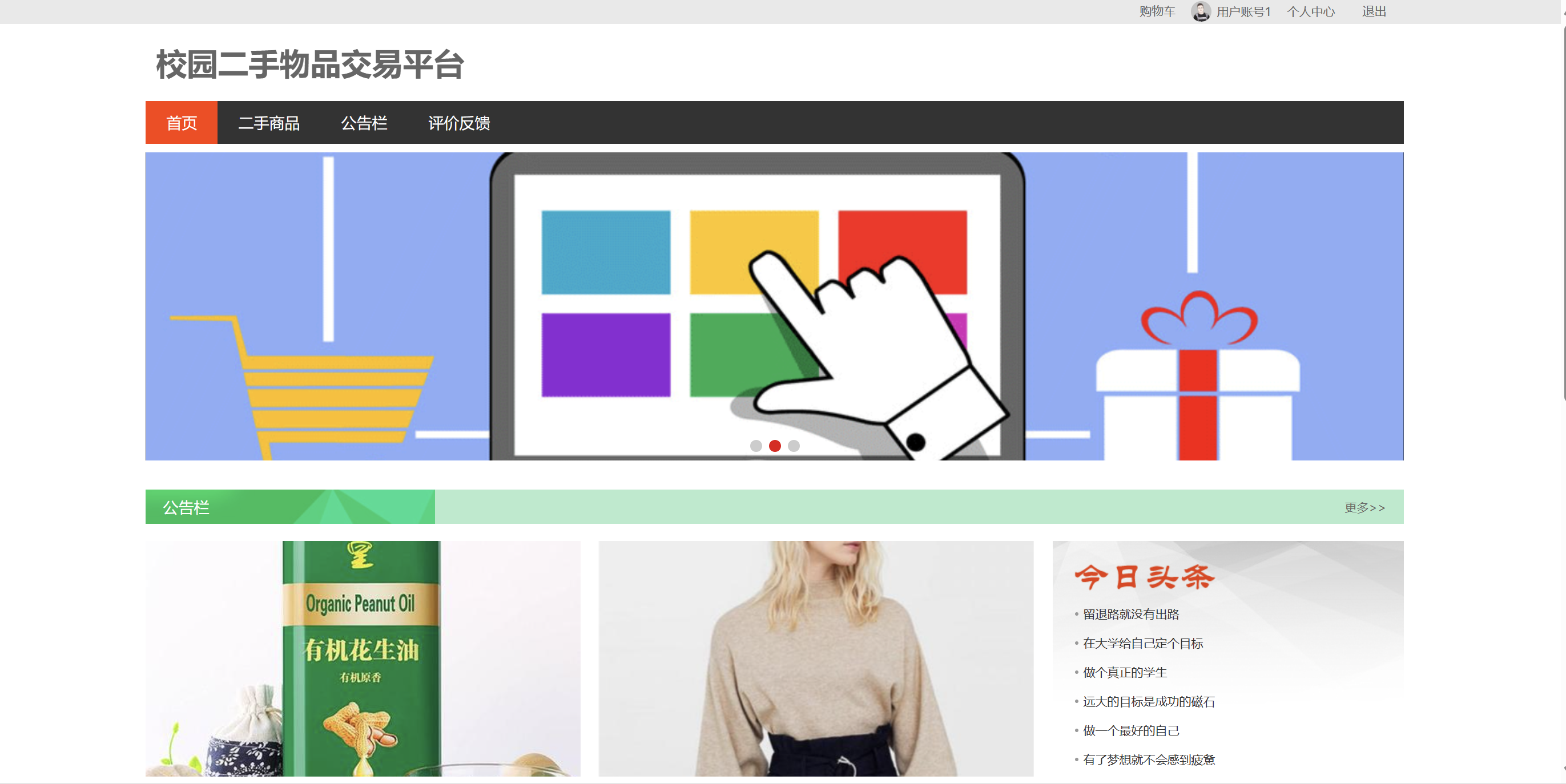 当游客打开系统的网址后,首先看到的就是首页界面。在这里,游客能够看到校园二手物品交易平台的导航条显示首页、二手商品、公告栏、评价反馈、购物车、个人中心等。系统首页界面如图5-1所示: