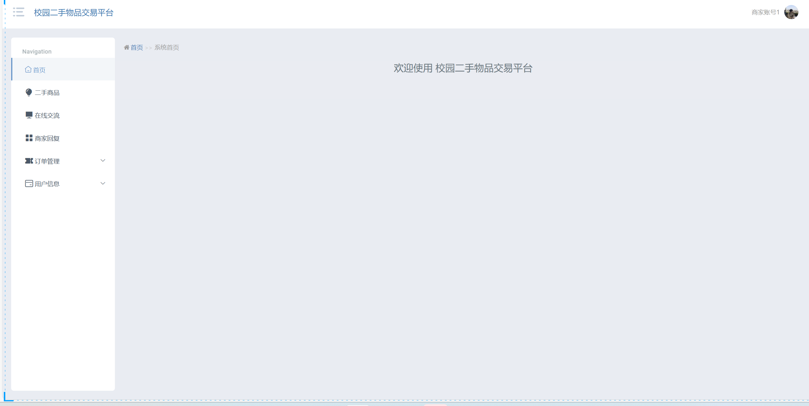 商家登录到系统主页面,主要功能包括对首页、二手商品、在线交流、商家回复、订单管理、用户信息等进行操作。商家主页面如图5-18所示: