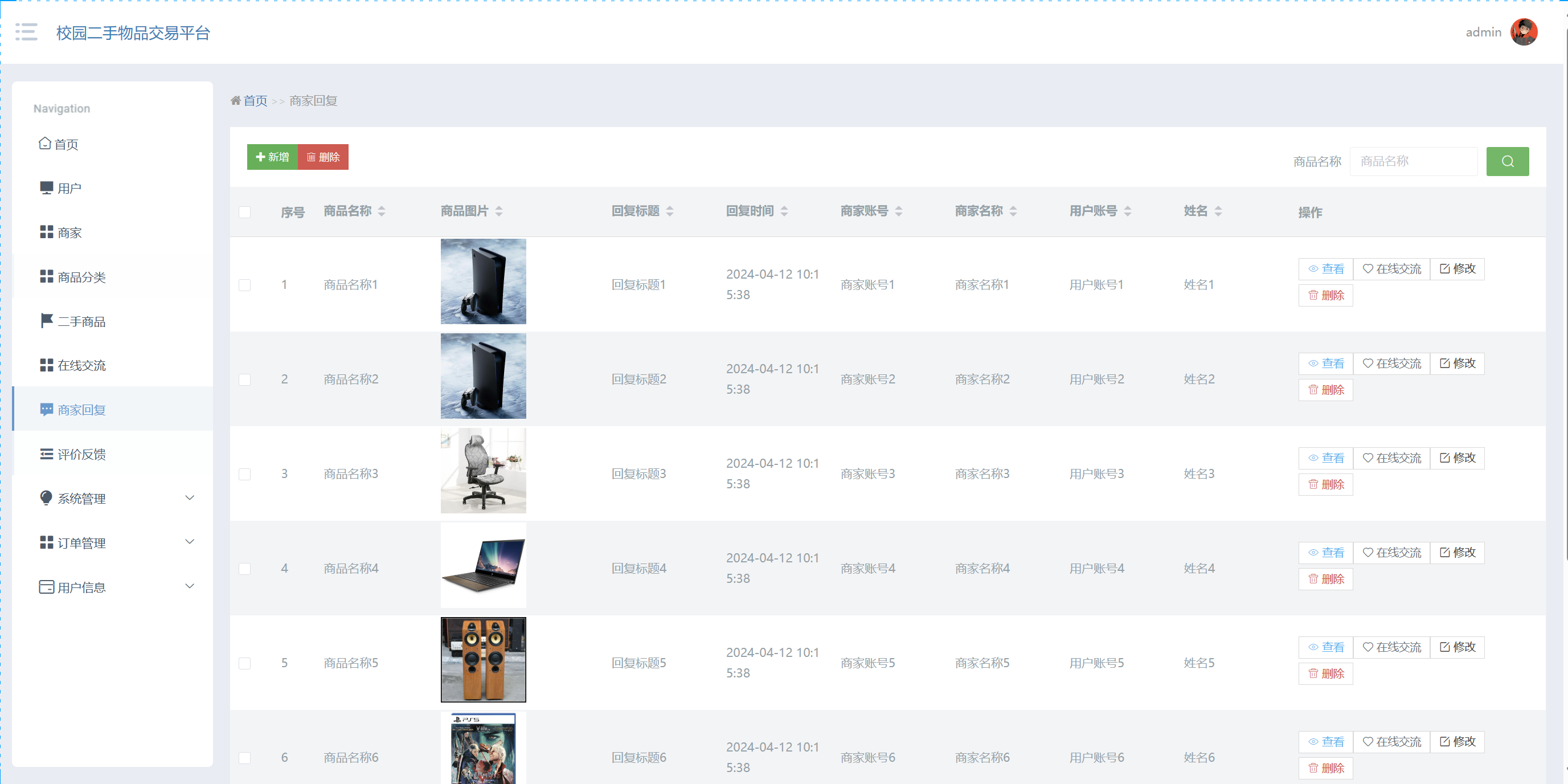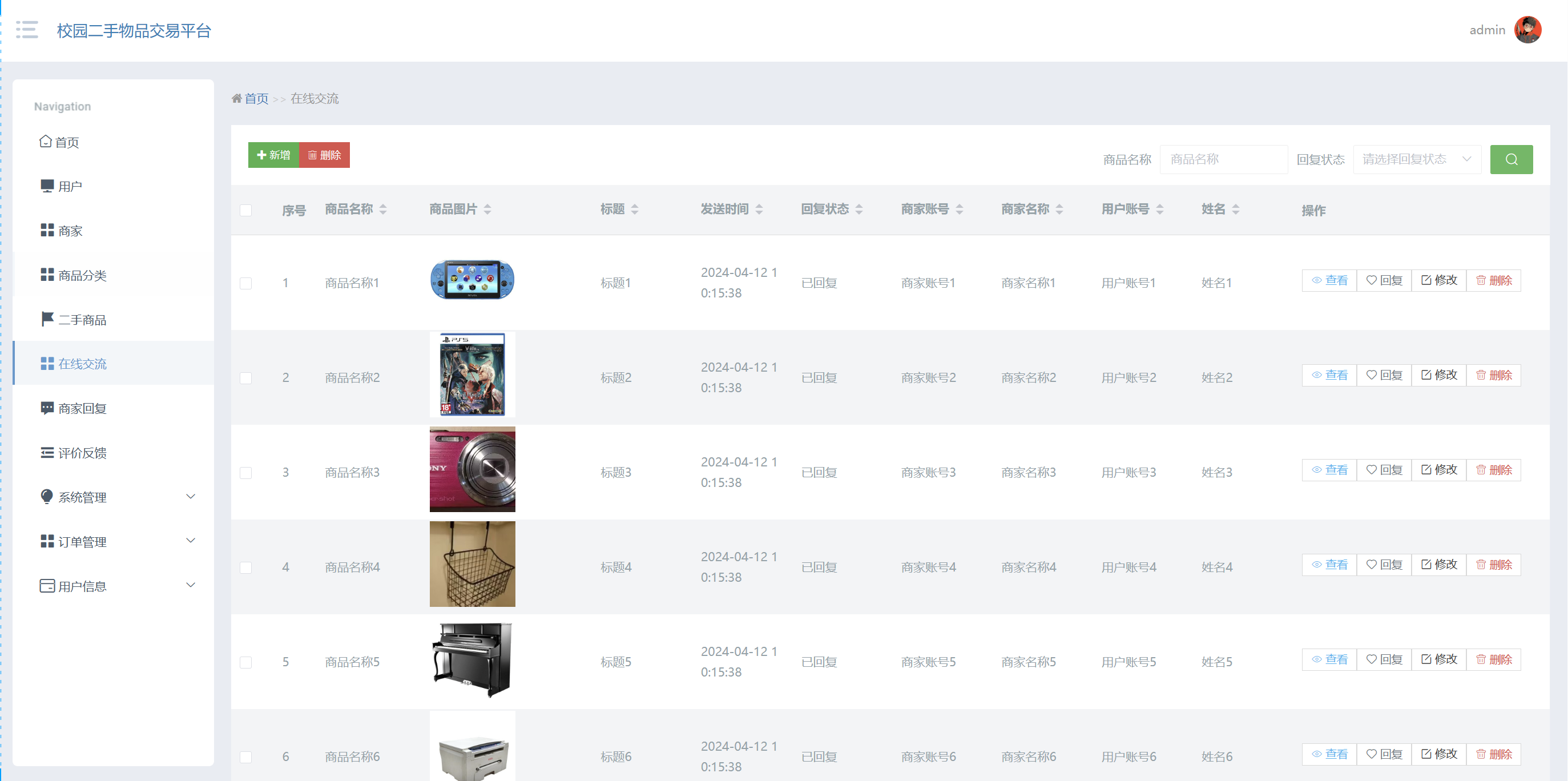 管理员点击在线交流:在在线交流页面,可以对商品名称、商品图片、标题、发送时间、回复状态、商家账号、商家名称、用户账号、姓名等信息,进行查询、新增或者删除在线交流等操作,如图5-13所示:
