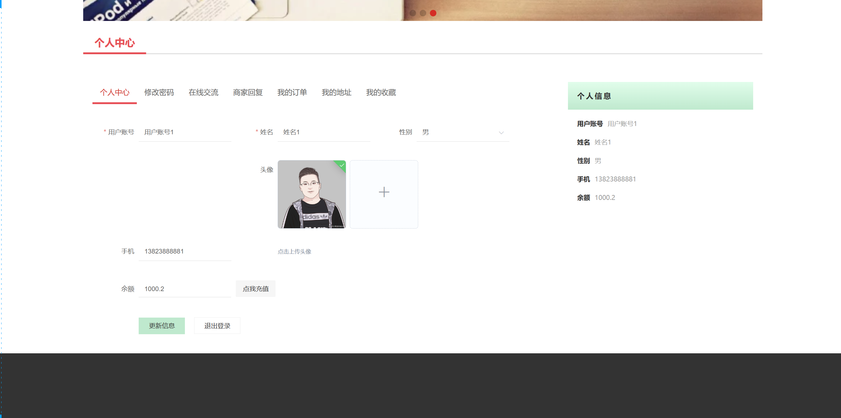 在个人中心页面可以输入个人详细信息,进行信息更新操作,还可以对修改密码、在线交流、商家回复、我的订单、我的地址、我的收藏进行操作。如图5-6所示。