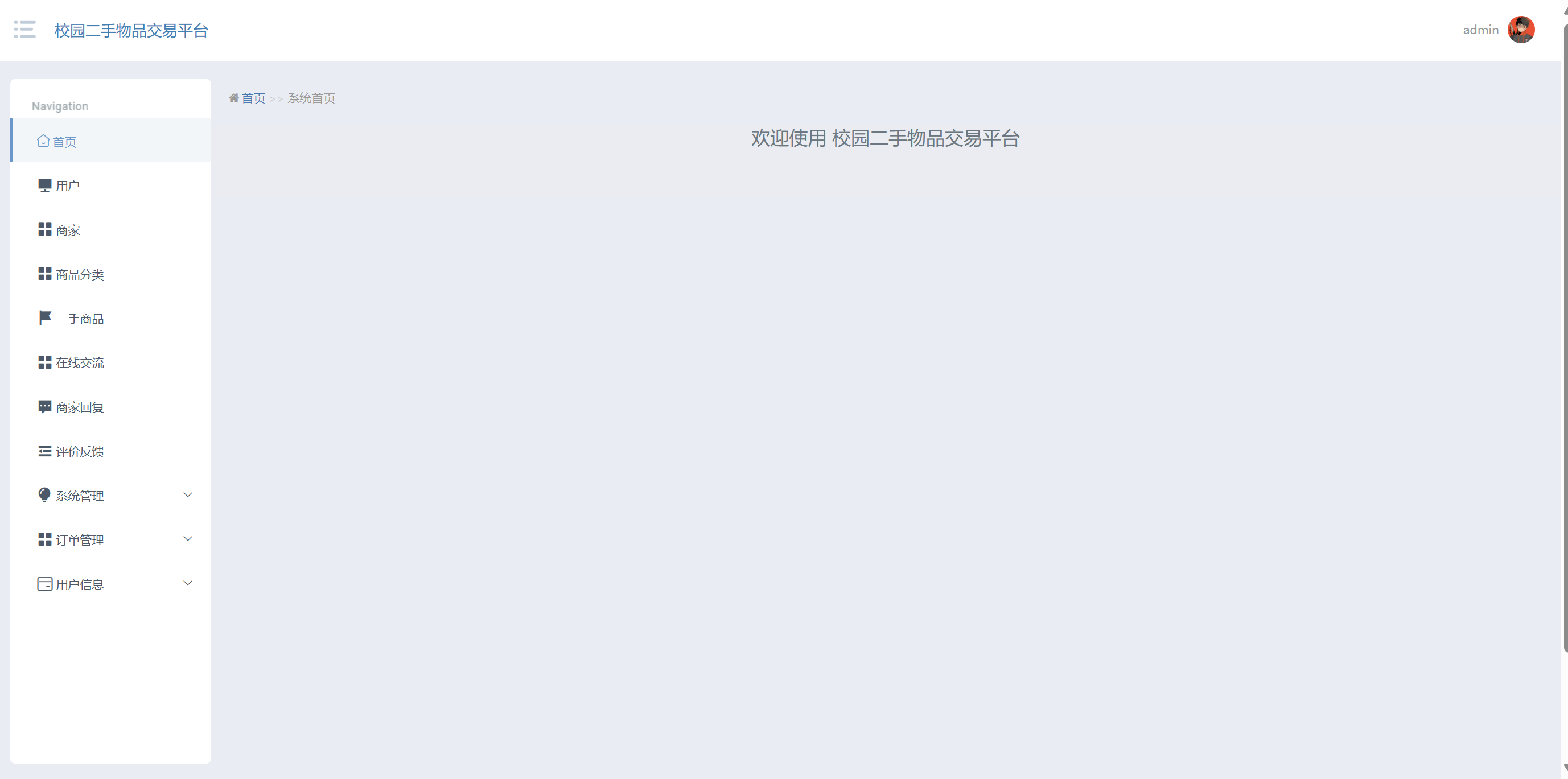 管理员进入系统主页面,主要功能包括对首页、用户、商家、商品分类、二手商品、在线交流、商家回复、评价反馈、系统管理、订单管理、用户信息等进行操作。管理员主页面如图5-8所示: