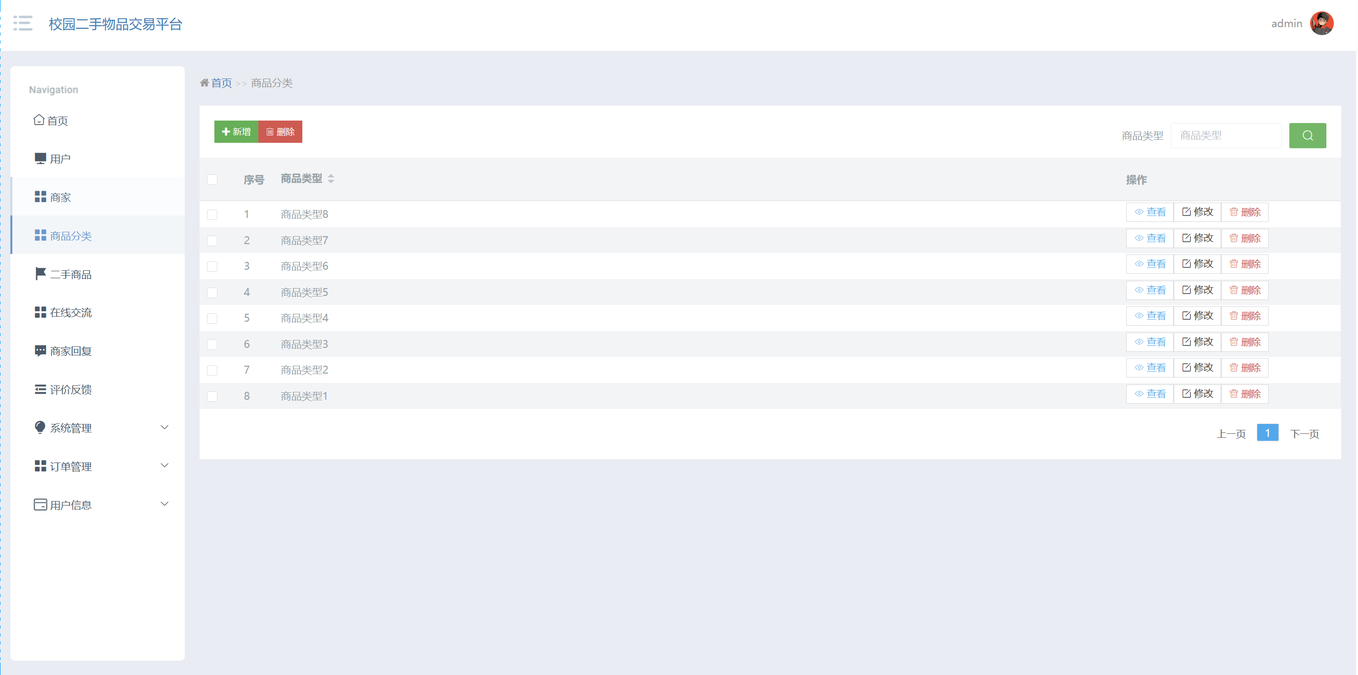 管理员点击商品分类:在商品分类页面,可以对商品分类等信息,进行查询、新增或者删除商品分类等操作,如图5-11所示: