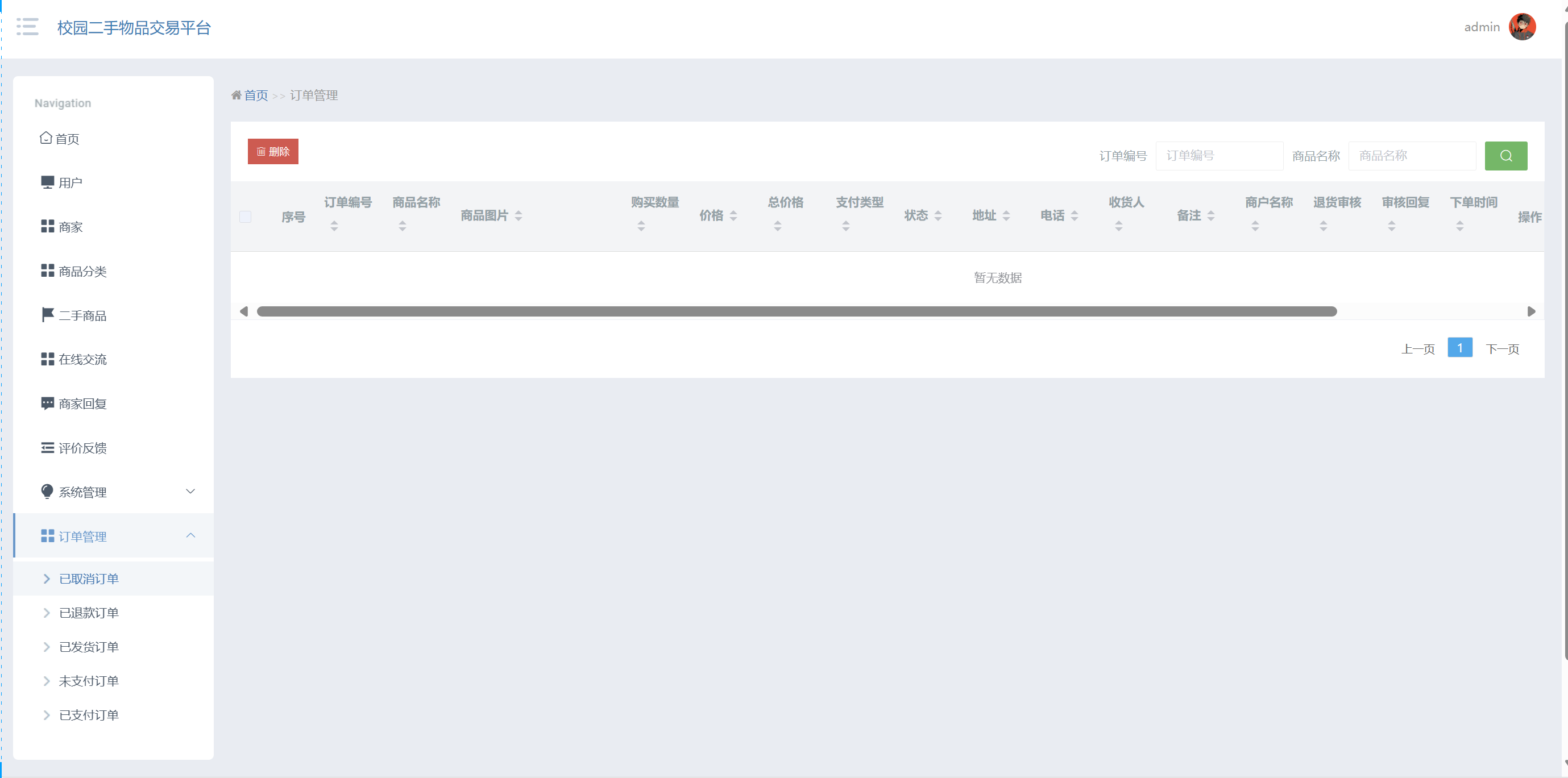 管理员点击订单管理:在订单管理页面,可以对订单编号、商品名称、商品图片、购买数量、价格、总价格、支付类型、状态、地址、电话、收货人、备注、商户名称、退货审核、审核回复、下单时间等信息,进行查询或者删除订单信息等操作,如图5-16所示: