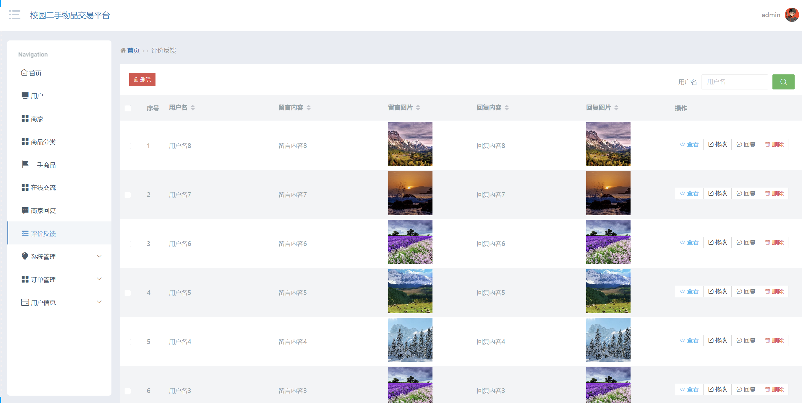 管理员点击评价反馈:在评价反馈页面,可以对用户名、留言内容、留言图片、回复内容、回复图片等信息,进行搜索或者删除评价反馈等操作,如图5-15所示: