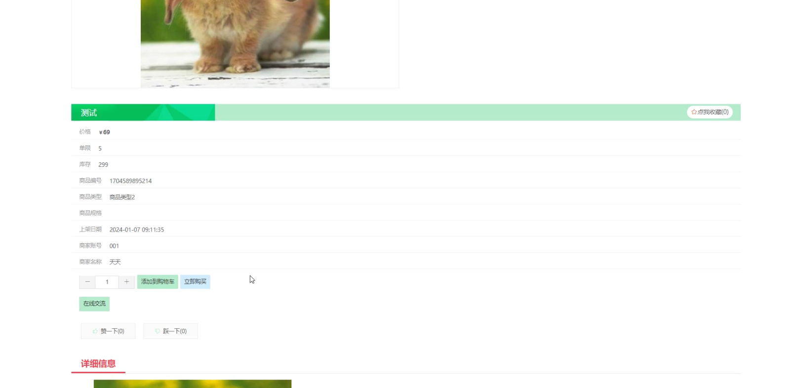 用户点击二手商品,在二手商品页面的输入栏填写商品名称、价格,进行查询,然后还可以查看商品编号、商品名称、商品类型、商品图片、商品规格、上架日期、商家账号、商家名称、单限、库存、评论数、价格、收藏数等信息,如有需要可以进行添加到购物车、立即购买、在线交流、收藏或者评论等操作。如图5-4所示: