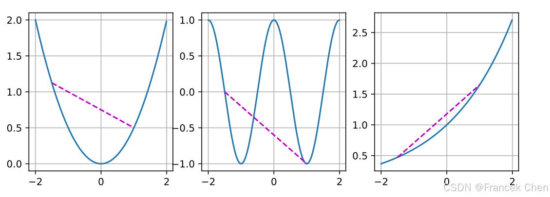 不出所料,余弦函数为非凸的,而抛物线函数和指数函数为凸的。请注意,为使该条件有意义,