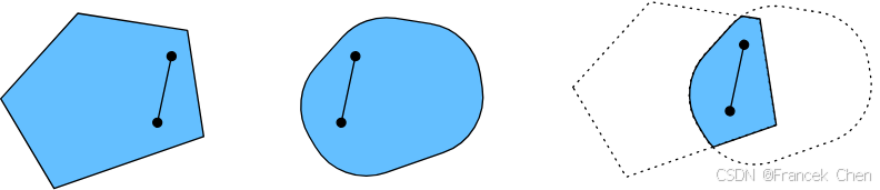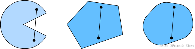 \lambda a + (1-\lambda) b \in \mathcal{X} \text{ 当 } a, b \in \mathcal{X} \tag{1} 这听起来有点抽象,那我们来看一下图1里的例子。第一组存在不包含在集合内部的线段,所以该集合是非凸的,而另外两组则没有这样的问题。