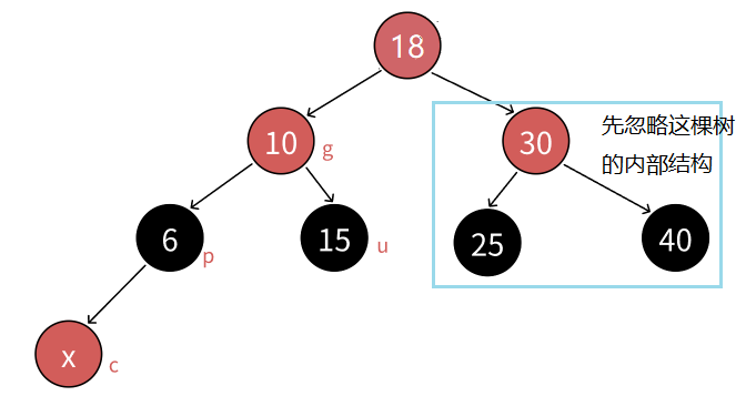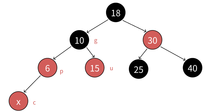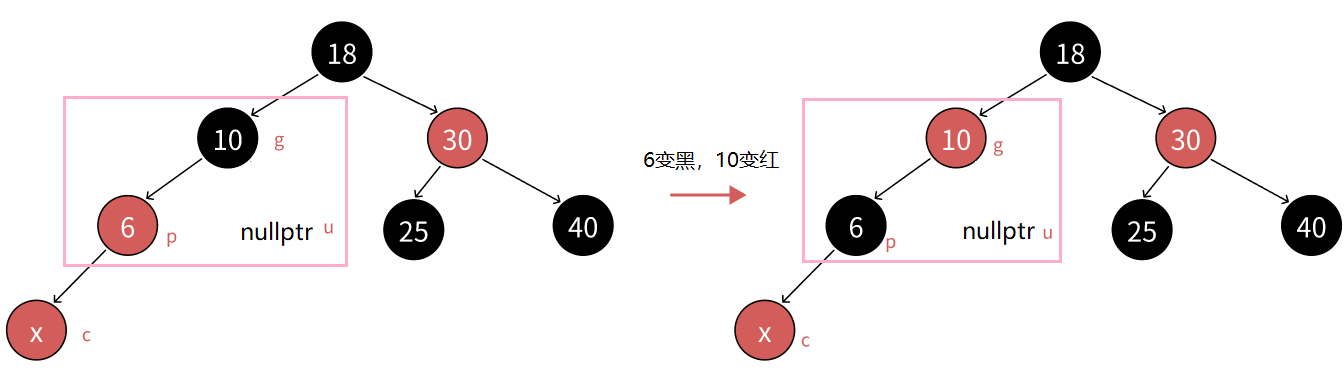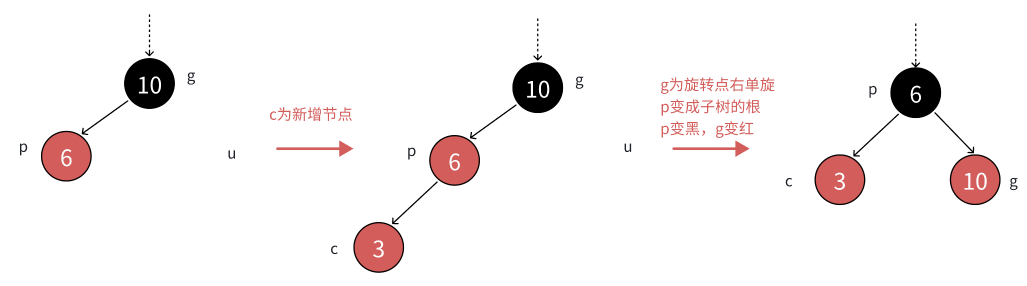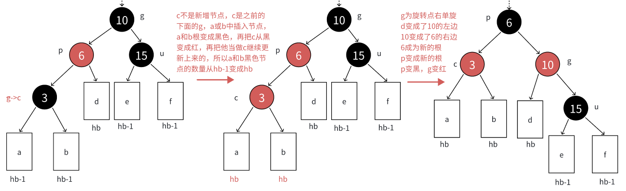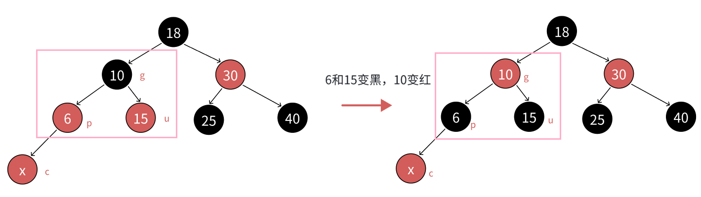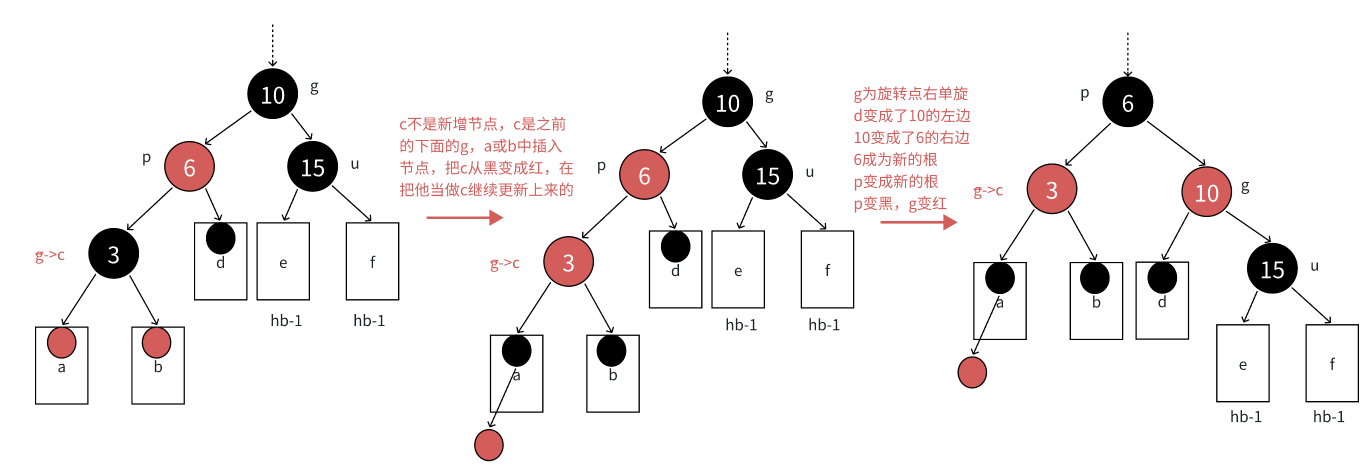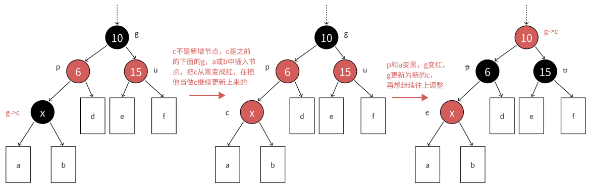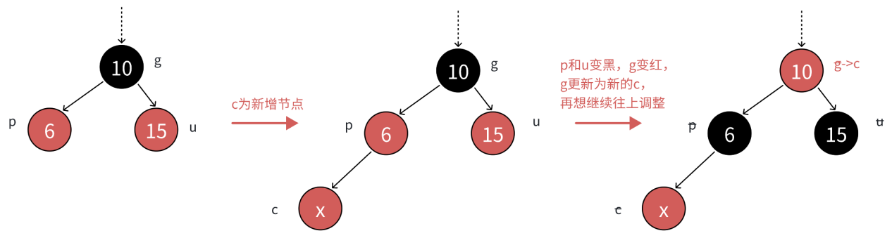 因为p和u都是红⾊,g是⿊⾊,把p和u变⿊,左边⼦树路径各增加⼀个⿊⾊结点, g再变红 ,左边⼦树路径各减少⼀个⿊⾊结点,相当于 保持g所在⼦树的 ⿊⾊ 结点的数量不变 ,同时 解决了c和p连续红⾊结点的问题 。