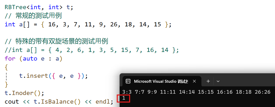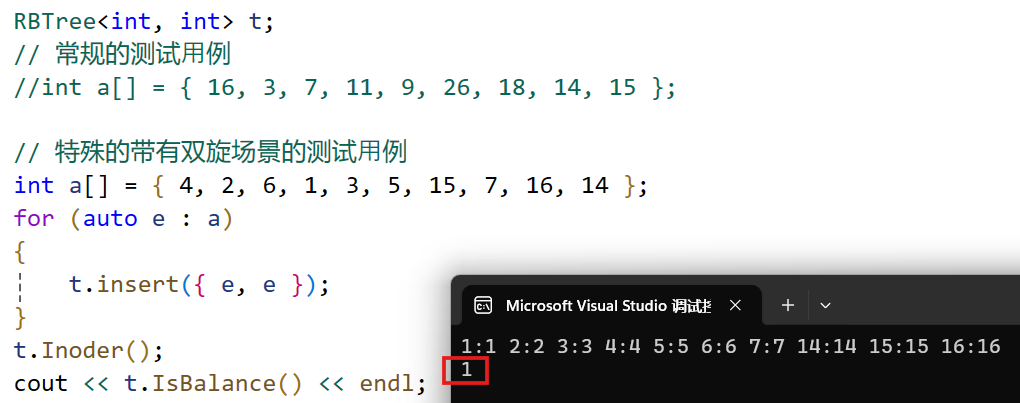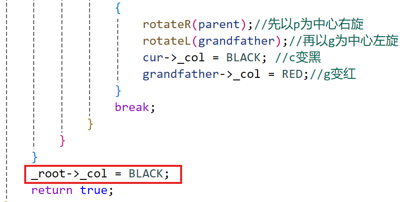 }在最后加上这句代码。不管怎么变色,根都是黑色,直接加上这句也不用分情况讨论根节点情况了。最后返回true。