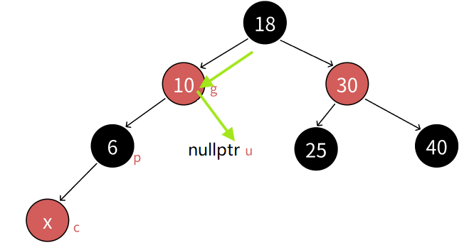 因为这导致如下绿色标记的路径上只有1个黑色节点,别的路径都是2个。( 要切记路径是要走到nullptr)
