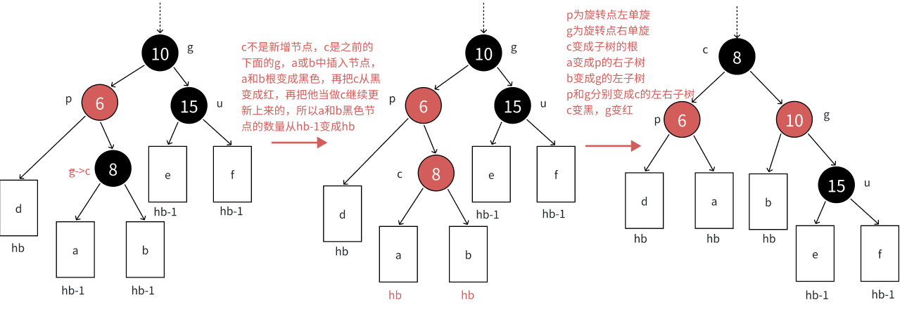 前面说的都是会触发单旋的情况,因为g、p、c在一边,如果g、p、c不在同一边,就会触发双旋+变色的情况。