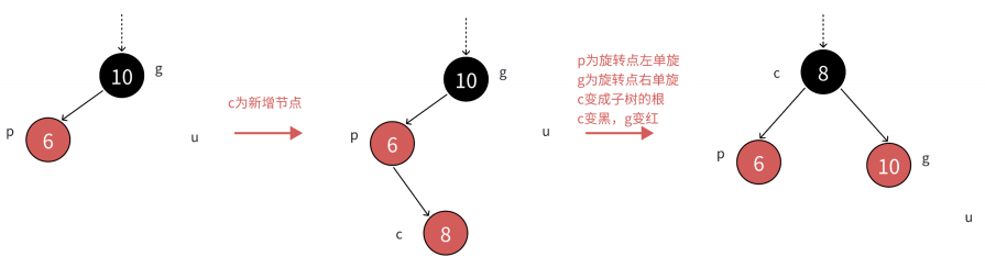 c为新增,我们可以选择对g这个节点进行左右双旋,也可以选择先对p节点进行左单旋,然后对g节点右单旋,结果都是一样的,这里主要体现在代码实现上。